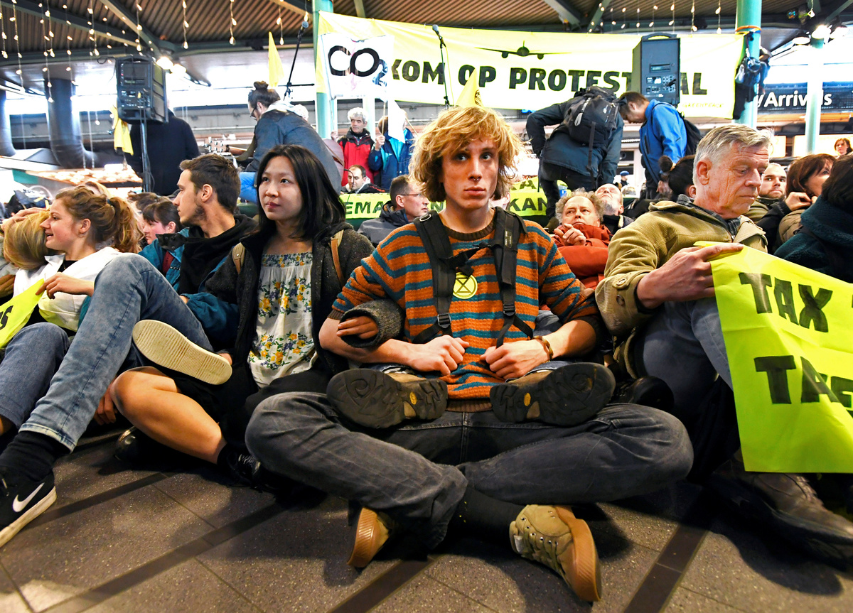 A group of around 100 activists from Greenpeace and Extinction Rebellion gathered inside the airport's entrance hall, chanting slogans for "climate justice" and carrying signs including one that advised travelers to "take the train".