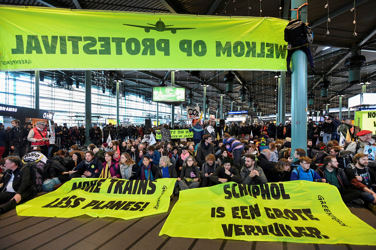 Hundreds of protesters had arrived for a demonstration against "the big polluter" Schiphol organized by Greenpeace, which had been granted a permit to protest outside the building only. The group rejected that condition, saying citizens' rights to peaceful protest should not be restricted.