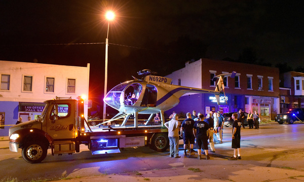 A tow truck carried the helicopter away from the scene shortly after 11 p.m.