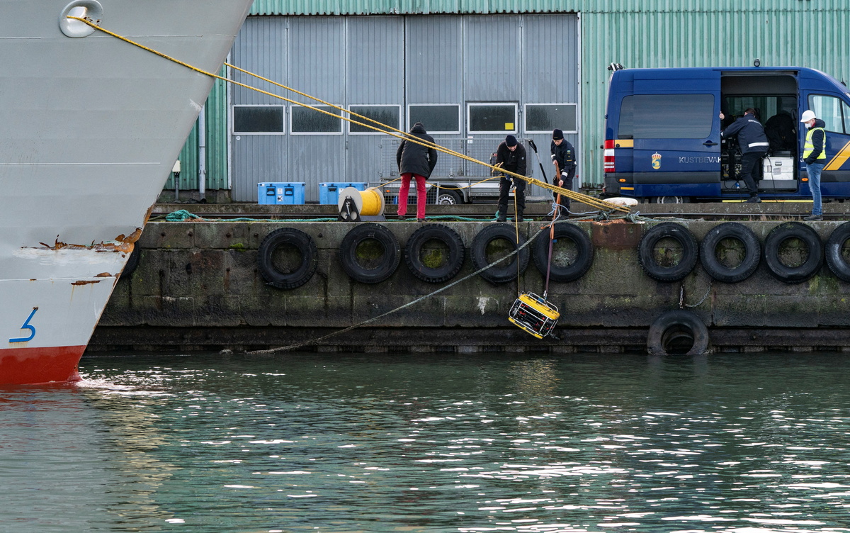The overturned Karin Hoj was towed into shallow water on Monday to allow divers to gain access without the risk of being pulled down if it sinks. The Swedish Coastguard plans to move it again to a place where it can be turned upright.