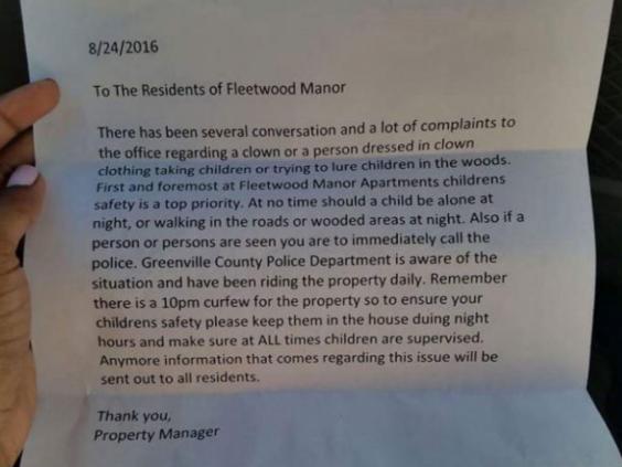 Several residents of the Fleetwood Manor complex in Greenville reported that they saw a clown in white face paint who tried to entice children by displaying a large amount of cash.
