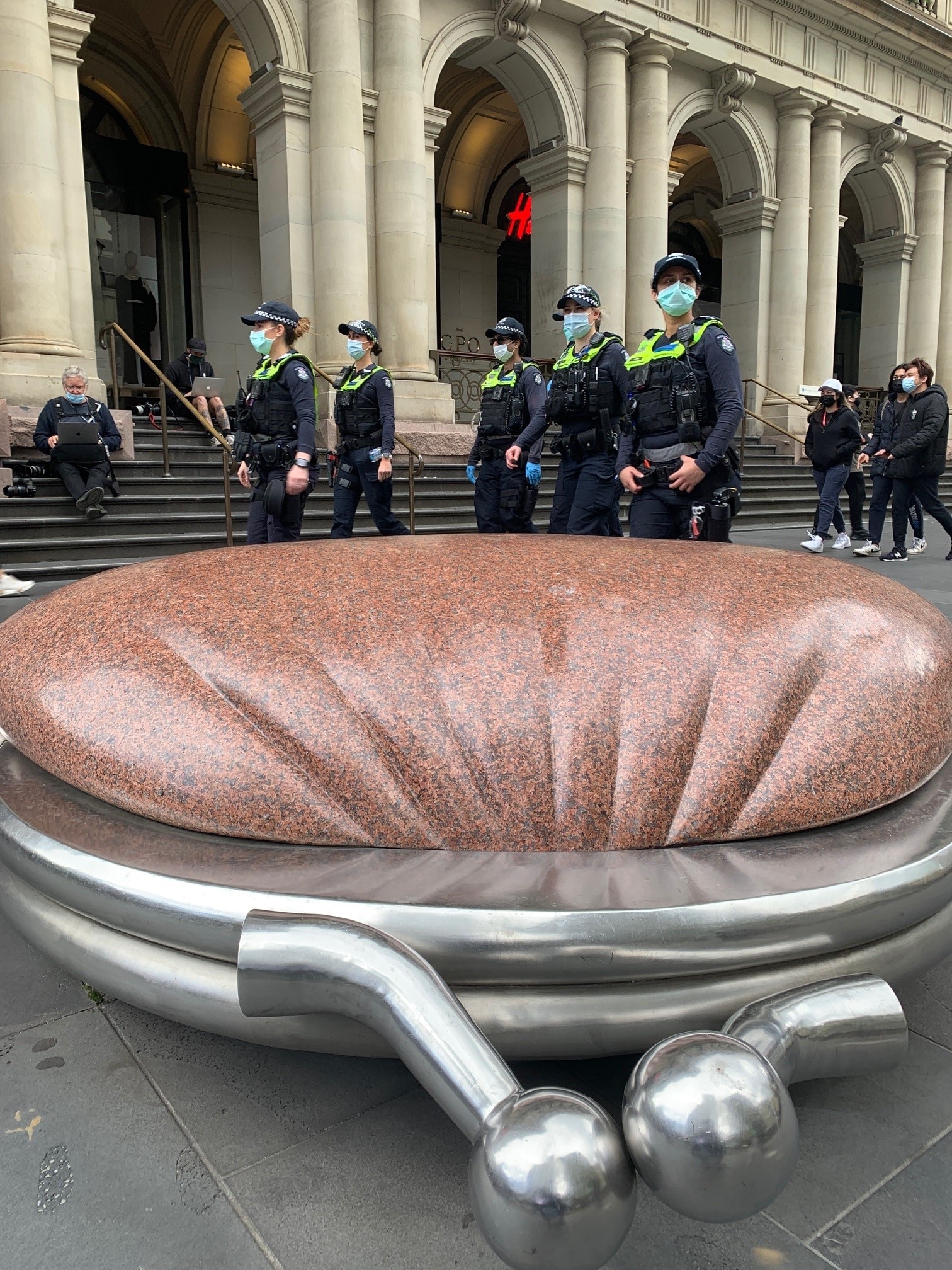 There was a heavy police presence in inner Melbourne throughout the morning, with protesters mostly found in smaller groups scattered across the city and nearby suburbs.