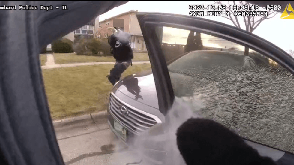 The Lombard police department released a screenshot from an officer’s body camera that it says shows the suspect firing at the officer. Smoke can be seen coming from what looks like a gun pointed straight at the camera.