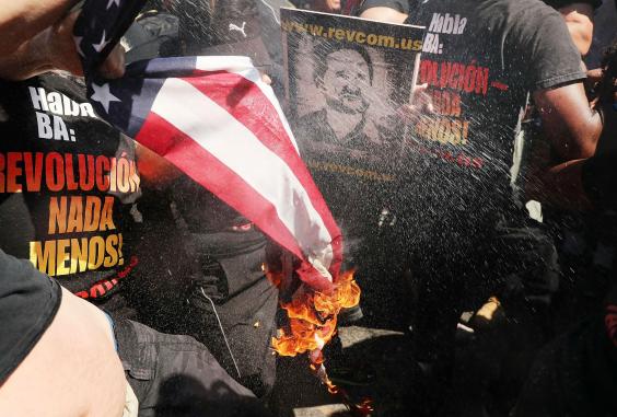 Tensions rose further after protesters burned an American flag, and police hurriedly put out the flames.
