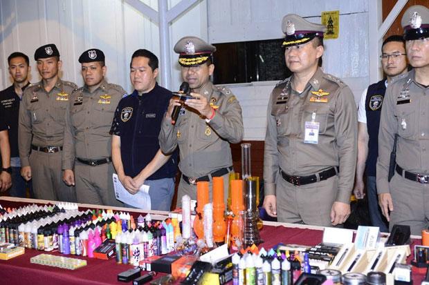 On Sunday police raided another 21 shops at night markets and arrested 16 Thais and two Myanmar nationals, seizing 1,127 bottles of liquid nicotine solution, 81 e-cigarettes and hookahs and 752 accessories, worth about 425,000 baht.