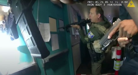 Within minutes, they hear a gunshot, then another, followed by two more. As they come to another door, one of the team looks through a small window and says: “I’ve got somebody down” inside. The team opens the door and somebody shouts “Let me see your hands!”