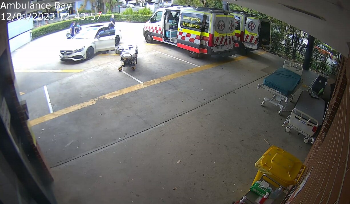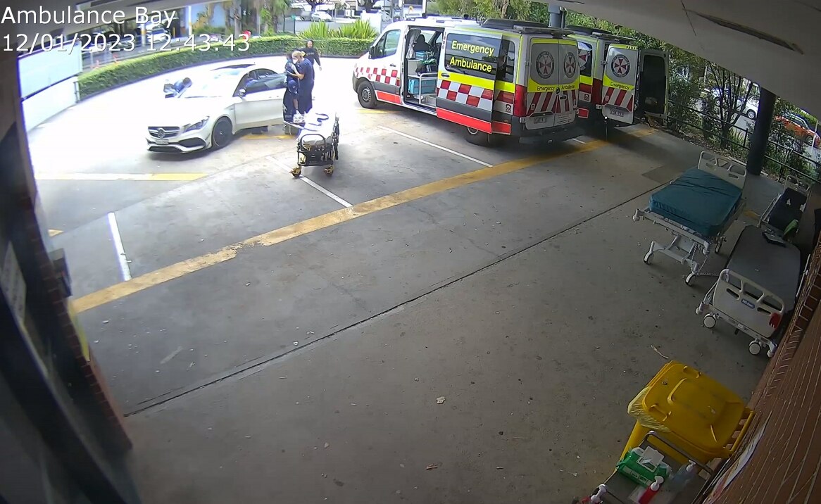 The footage shows a man wearing a black hooded jumper, shorts and training tights run out from the driver's seat and calling to paramedics standing outside the emergency department.