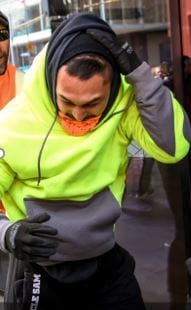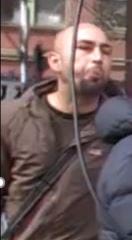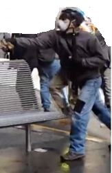 The man who spat on the victim is also of Caucasian appearance, with facial hair, a balding or shaved head, and was wearing a brown jacket and dark pants.