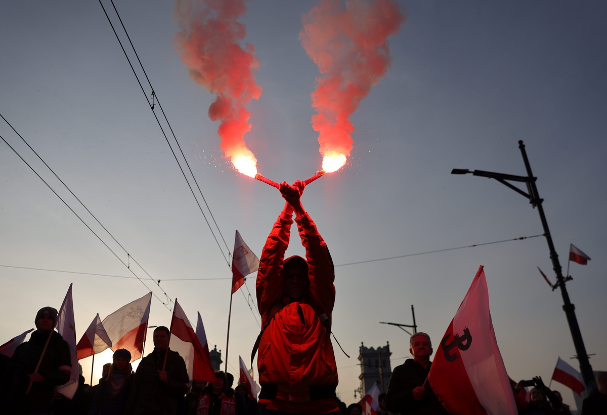 Thousands gathered in Warsaw for an annual Independence Day march carrying Polish and nationalist group flags, an event the far-right organizers dedicated to uniformed "protectors of the border" amid an escalating migrant crisis at the country's eastern border.