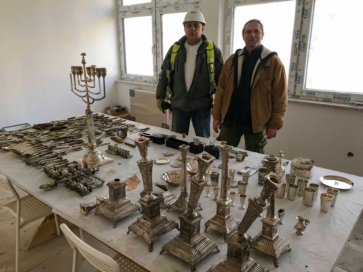 Around 400 items, including silver-plated menorahs, hanukkiahs, tableware and daily use items were uncovered in the city of Lodz last month during the renovation of a house and yard.
