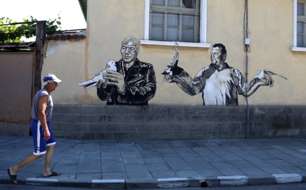 Local villager Kancho walks past a wall with murals, depicting former boxer Mike Tyson on a house in the village of Staro Zhelezare, Bulgaria, July 28, 2017. REUTERS/Stoyan Nenov