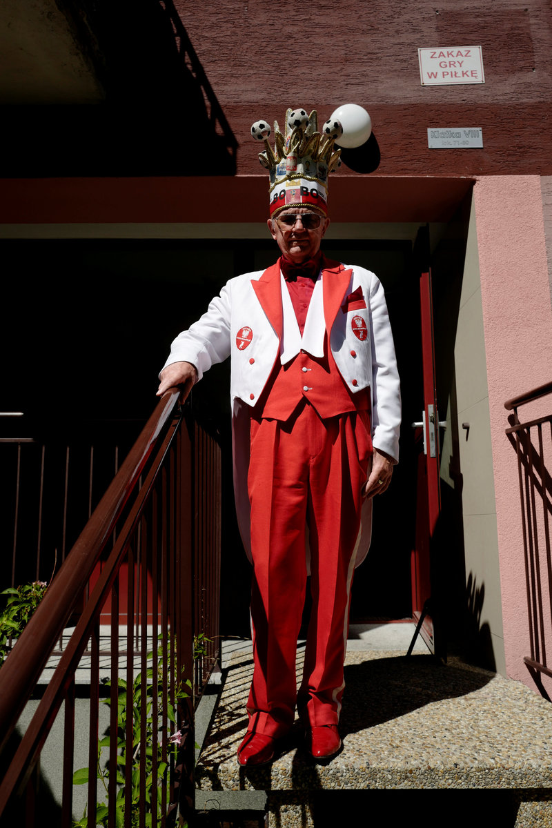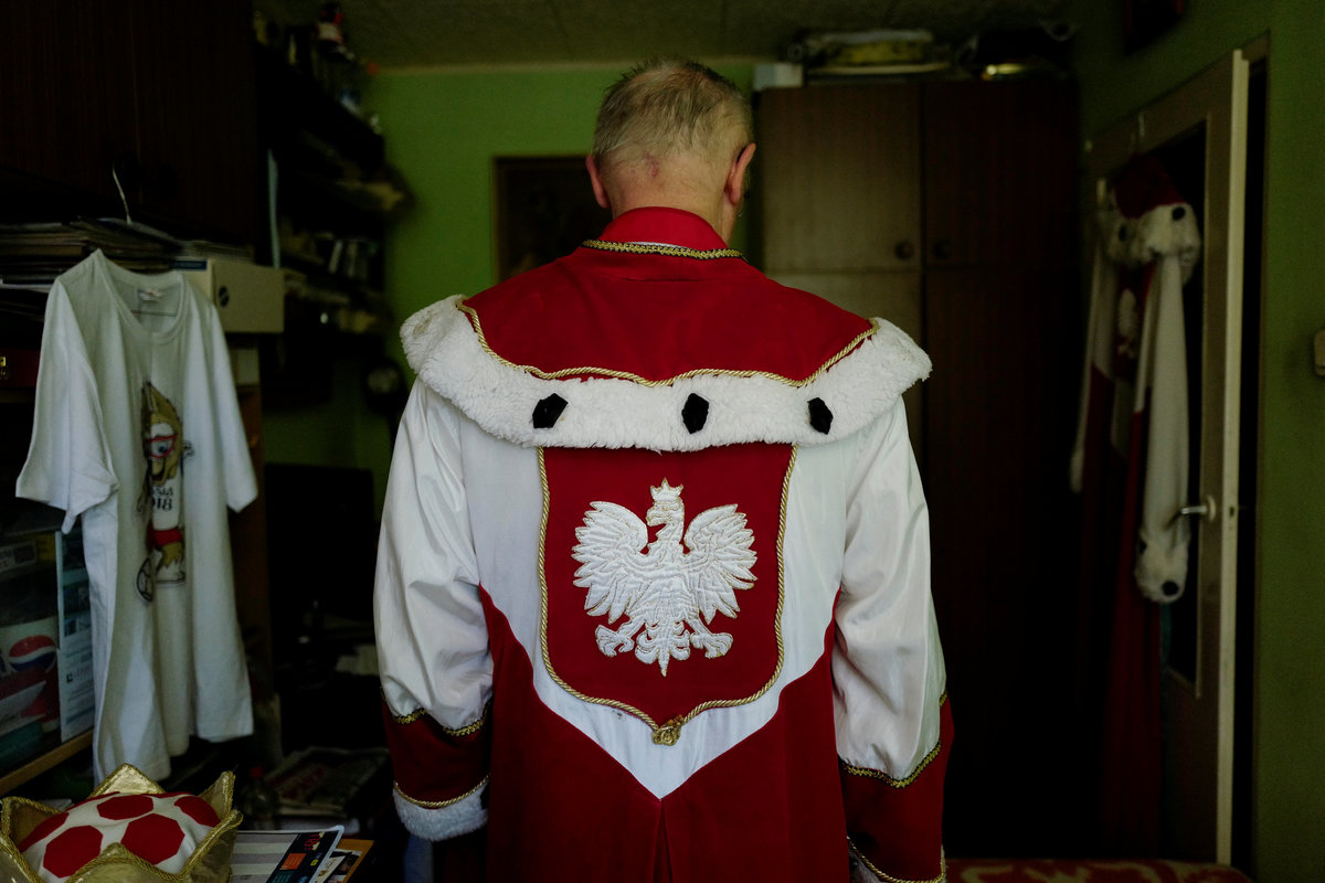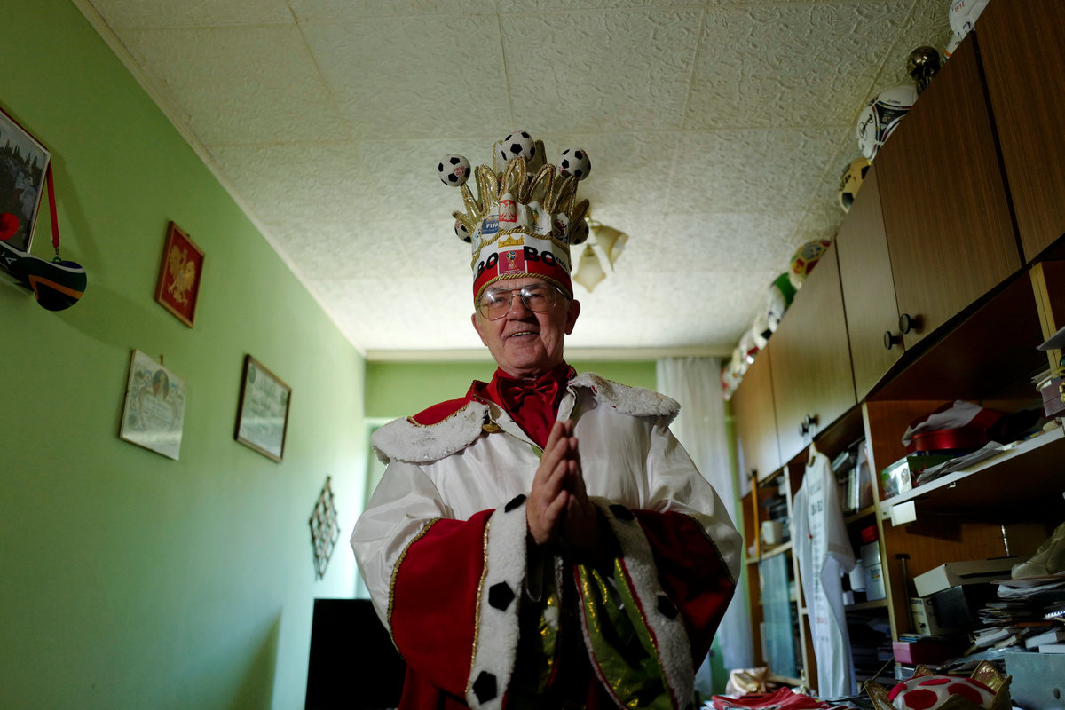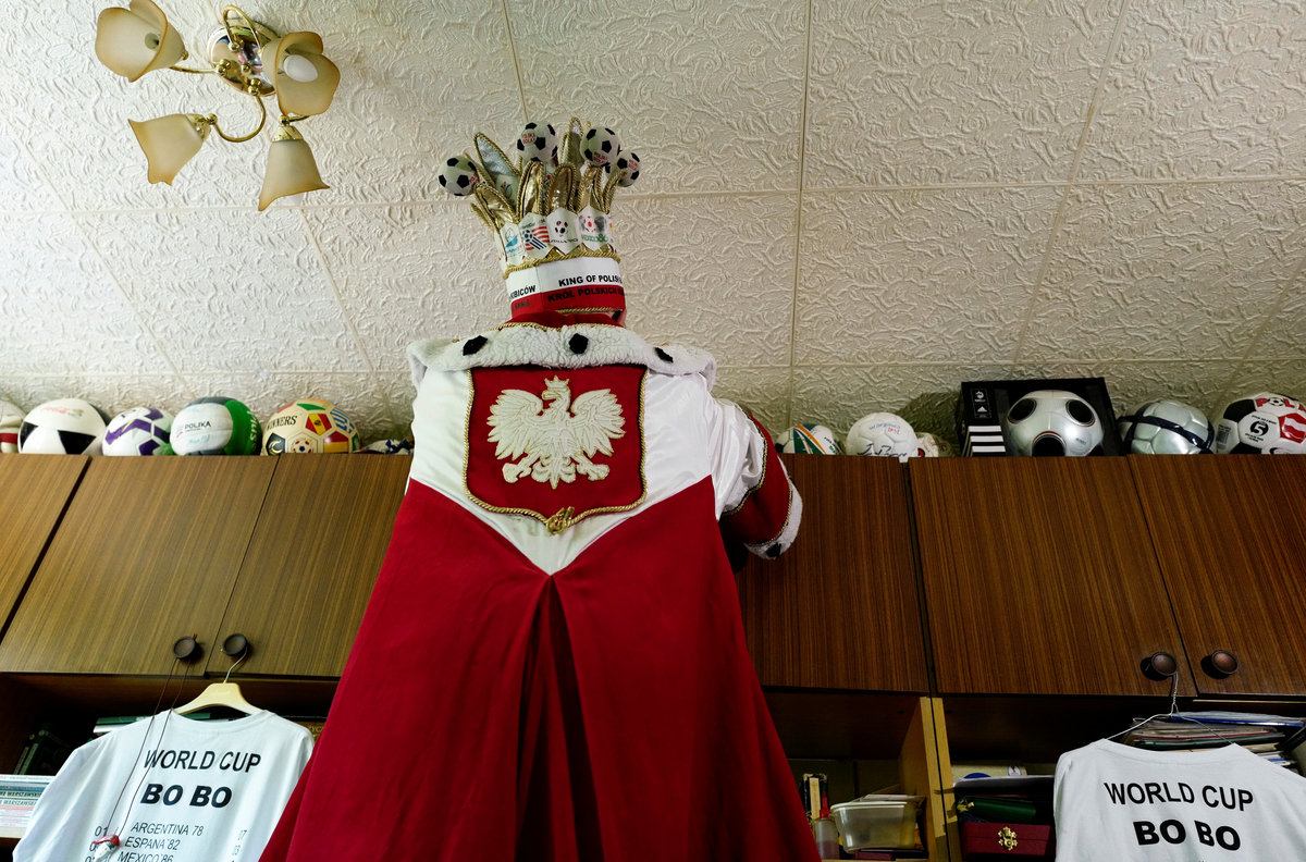 And on his head, above the mandatory scarf, a soft golden crown, decorated with badges from the tournaments he has attended, and emblazoned with the slogan "King of Polish fans".