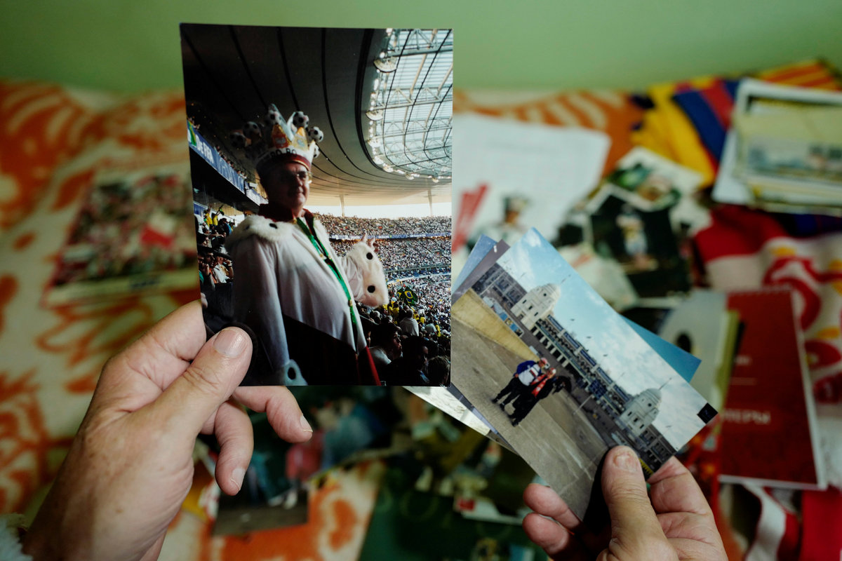 Andrzej "Bobo" Bobowski, known as "the King of Polish fans" presents pictures from his previous trips to World Cups at his apartment in Warsaw, Poland June 6, 2018. Picture taken June 6, 2018. REUTERS/Kacper Pempel
