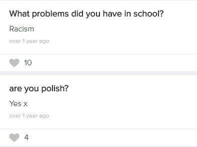 On website Ask.fm, she answered the question "What problems did you have in school?" with the word "racism".