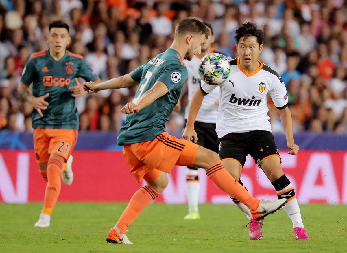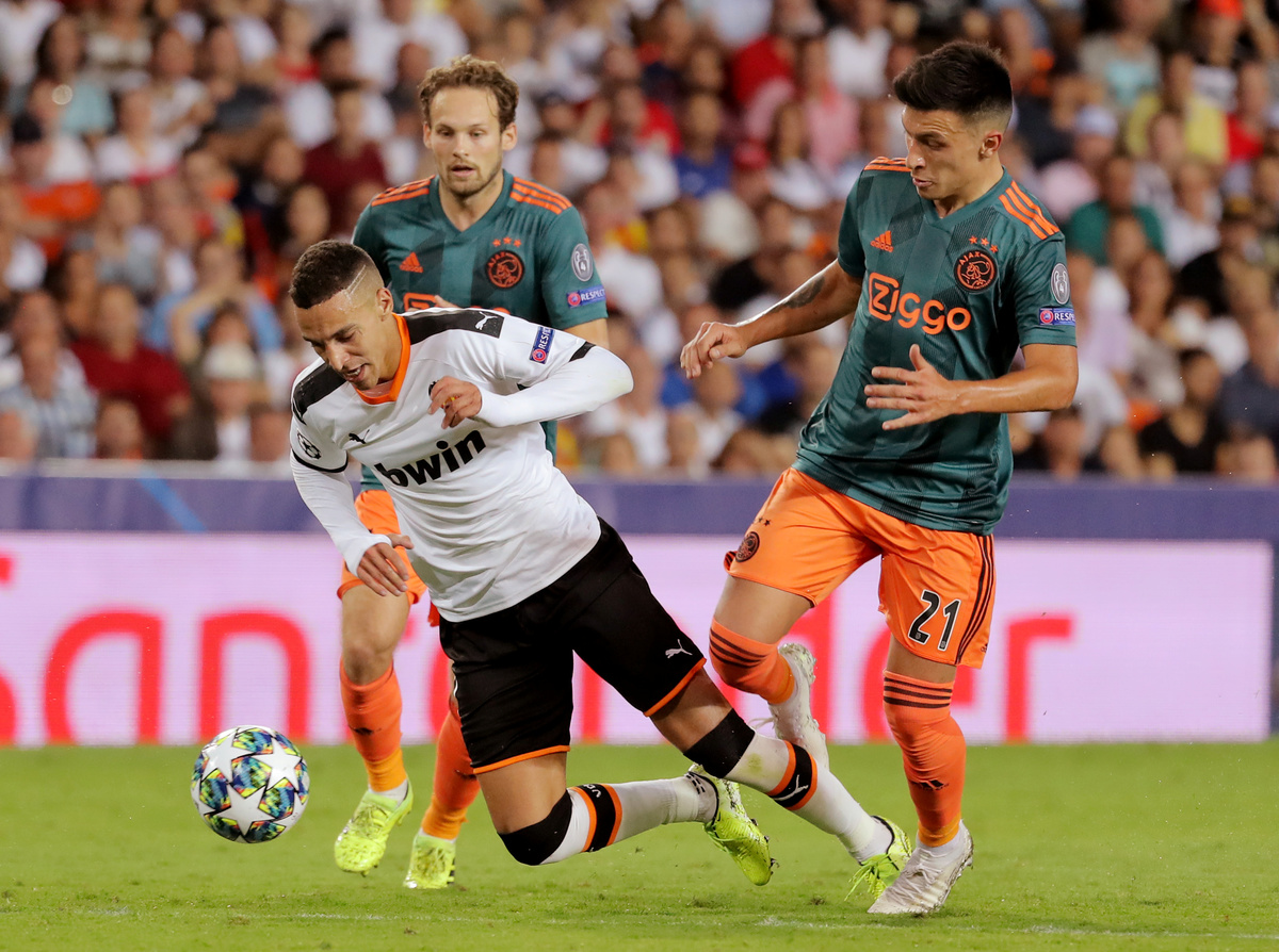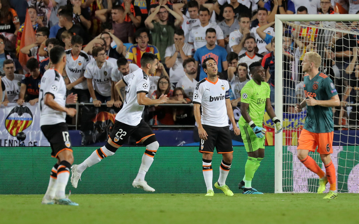 Soccer Football - Champions League - Group H - Valencia v Ajax Amsterdam - Mestalla, Valencia, Spain - October 2, 2019 Ajax's Daley Blind celebrates after the match REUTERS/Juan MedinaSoccer Football - Champions League - Group H - Valencia v Ajax Amsterdam - Mestalla, Valencia, Spain - October 2, 2019 Valencia's Jaume Costa reacts REUTERS/Juan MedinaSoccer Football - Champions League - Group H - Valencia v Ajax Amsterdam - Mestalla, Valencia, Spain - October 2, 2019 Ajax's Andre Onana celebrates their third goal REUTERS/Juan MedinaSoccer Football - Champions League - Group H - Valencia v Ajax Amsterdam - Mestalla, Valencia, Spain - October 2, 2019 Valencia's Lee Kang-in in action with Ajax's Joel Veltman REUTERS/Juan MedinaSoccer Football - Champions League - Group H - Valencia v Ajax Amsterdam - Mestalla, Valencia, Spain - October 2, 2019 Valencia's Dani Parejo reacts after missing a penalty REUTERS/Juan MedinaSoccer Football - Champions League - Group H - Valencia v Ajax Amsterdam - Mestalla, Valencia, Spain - October 2, 2019 Ajax's Donny van de Beek in action with Valencia's Francis Coquelin REUTERS/Juan MedinaSoccer Football - Champions League - Group H - Valencia v Ajax Amsterdam - Mestalla, Valencia, Spain - October 2, 2019 Valencia's Rodrigo Moreno in action with Ajax's Lisandro Martinez REUTERS/Juan MedinaSoccer Football - Champions League - Group H - Valencia v Ajax Amsterdam - Mestalla, Valencia, Spain - October 2, 2019 Valencia's Lee Kang-in in action with Ajax's Joel Veltman REUTERS/Juan MedinaSoccer Football - Champions League - Group H - Valencia v Ajax Amsterdam - Mestalla, Valencia, Spain - October 2, 2019 Valencia's Ferran Torres shoots at goal REUTERS/Juan Medina