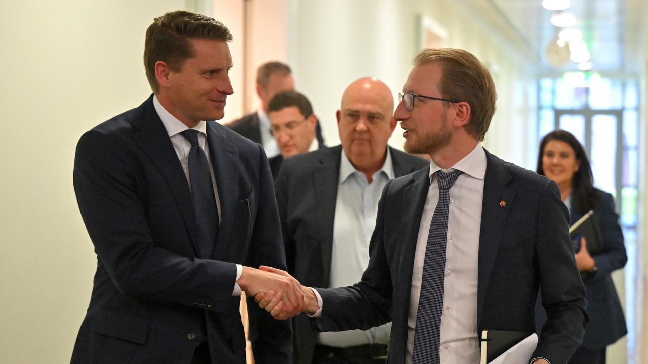 West Australian MP Andrew Hastie, who is seen as a potential leadership contender, was seen shaking hands with fellow net-zero opponent James Paterson as the pair left the meeting.