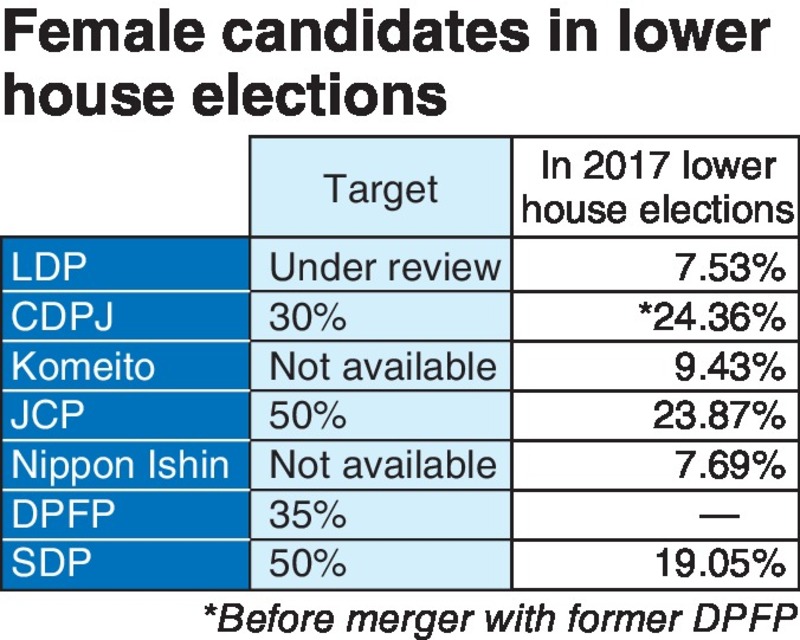 Among opposition parties, the CDPJ, the Japanese Communist Party, the Democratic Party for the People and the Social Democratic Party have set numerical targets for female candidates in the next lower house election. The CDPJ wants 30% of its candidates to be women, but as of Wednesday the percentage of female candidates expected to run was only 16.4%.