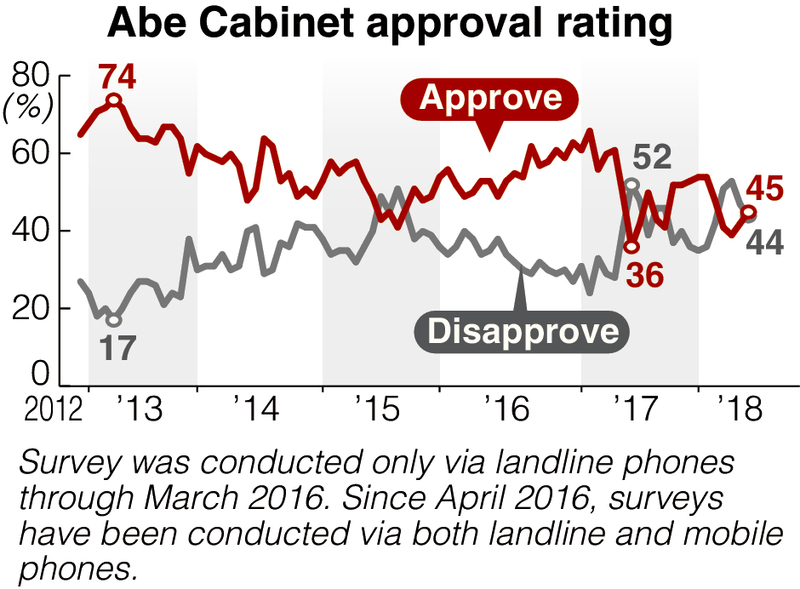 The approval rating of Abe's Cabinet rose slightly to 45 percent from 42 percent in the previous survey, while the disapproval rating declined to 44 percent from 47 percent.