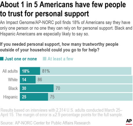 Millions of Americans are struggling through life with few people they can trust for personal and professional help, a disconnect that raises a key barrier to recovery from the social, emotional and economic fallout of the pandemic, according to a new a poll from The Impact Genome Project and The Associated Press-NORC Center for Public Affairs Research.