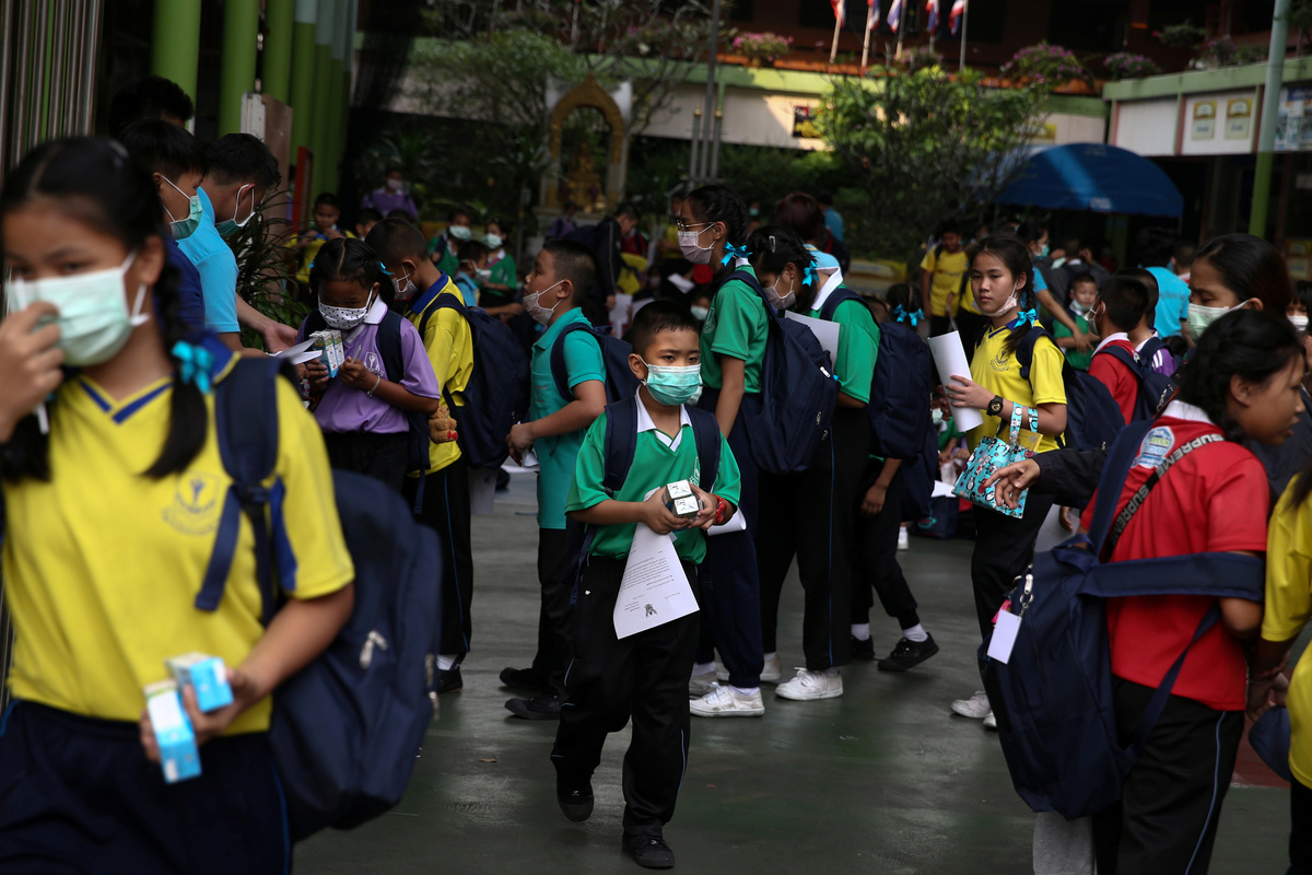 Student wear masks as they wait to be picked up, as classes in over 400 Bangkok schools have been cancelled due to worsening air pollution, at a public school in Bangkok, Thailand, January 30, 2019. REUTERS/Athit Perawongmetha