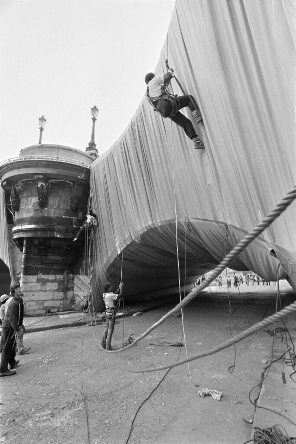 The process of installation – which took several weeks, from August to September 1985 – was a spectacle in itself. French media relayed every step, from the climbers who abseiled down the bridge pleating the fabric, to the divers who fixed the chains beneath the surface of the river.