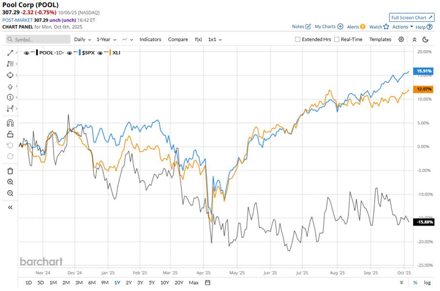 POOL stock has underperformed the S&P 500 Index’s ($SPX) 17.2% gains, with shares down 15.6% over the past 52 weeks. Also, it underperformed the Industrial Select Sector SPDR Fund’s (XLI) 14.5% rise over the same time frame.