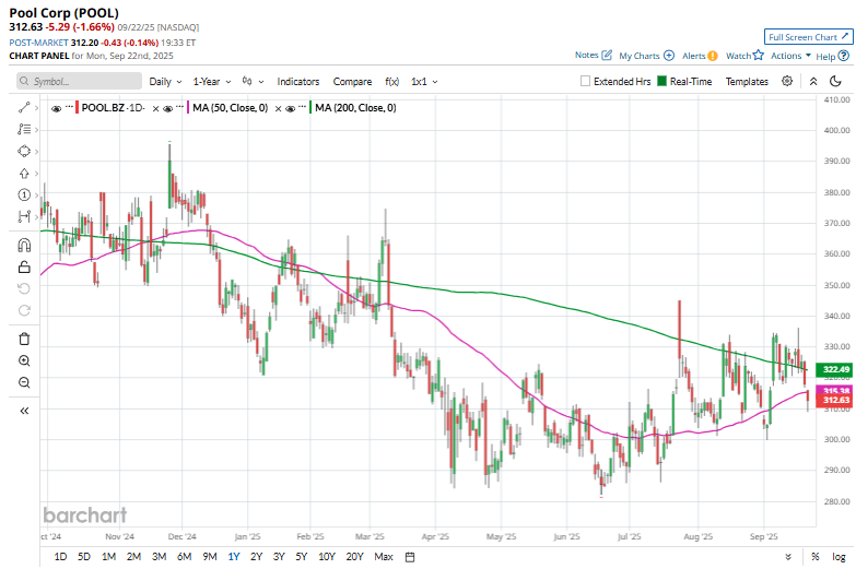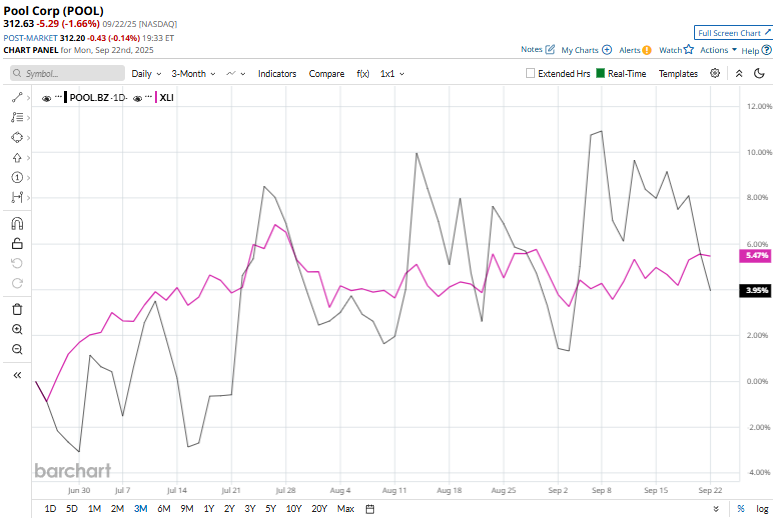 However, the pool giant is currently trading 21% below its 52-week high of $395.60 met on Nov. 25 last year. POOL shares have increased 8.4% over the past three months, surpassing the Industrial Select Sector SPDR Fund (XLI), which has gained 7.5% over the same time frame.