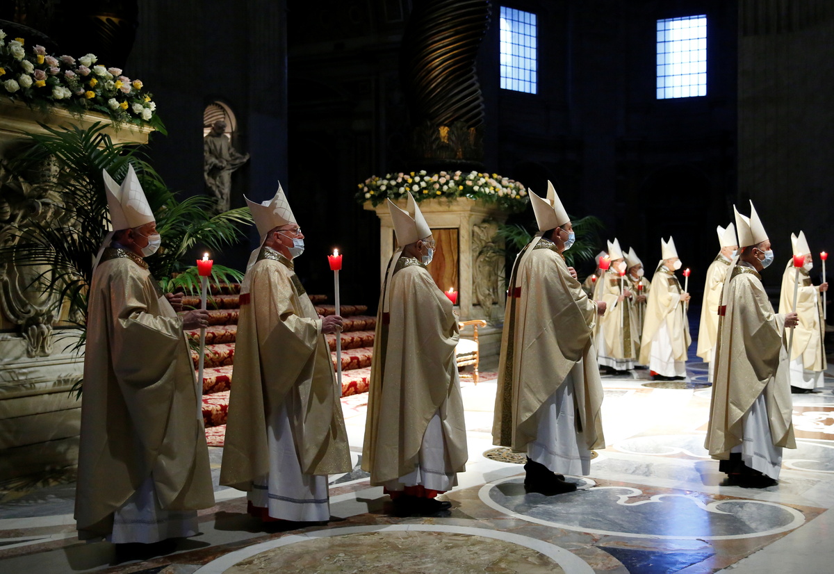 The service began two hours earlier than usual so that participants could get home before a 10 p.m. curfew in Rome, which, like the rest of Italy, is under tough lockdown restrictions during the Easter weekend.