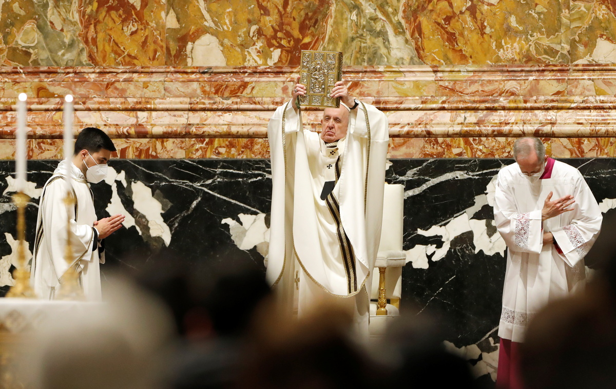 At the start of the service, the basilica was in darkness except for the flames from candles held by participants to signify the darkness in the world before Jesus. As the pope, cardinals and bishops processed to the altar and a cantor chanted three times, the basilica's lights were turned on.