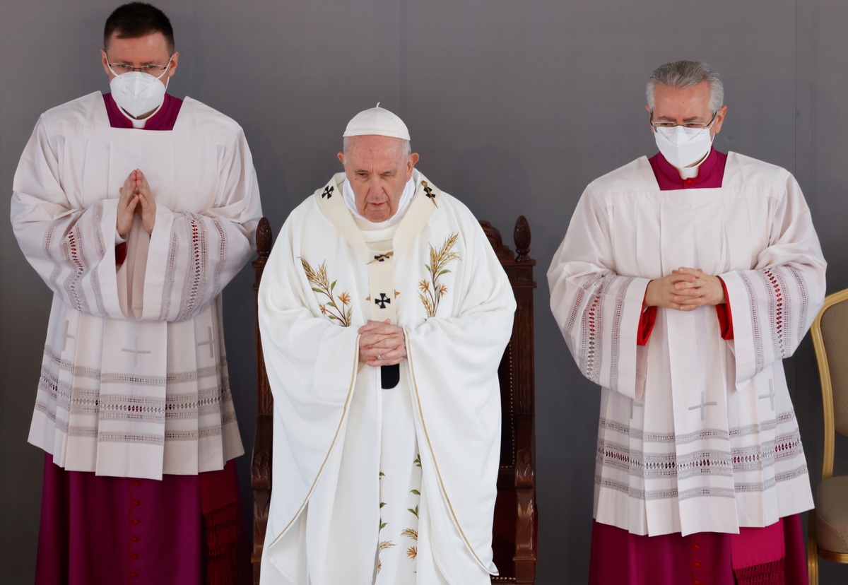 Pope Francis called on Friday for healing during an outdoor Mass in Cyprus within sight of a huge Turkish Cypriot flag on a mountainside on the other side of a line that has divided the island for nearly half a century.