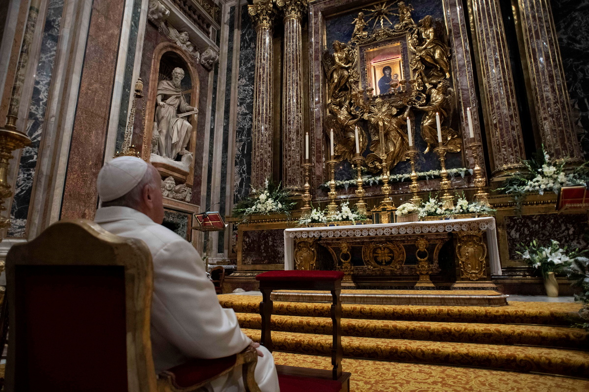 A Vatican statement said he had prayed for healing the victims of COVID-19, war and climate change, and asked the Madonna to "melt the stone hearts of those who put up walls to keep other people's pain away from them".