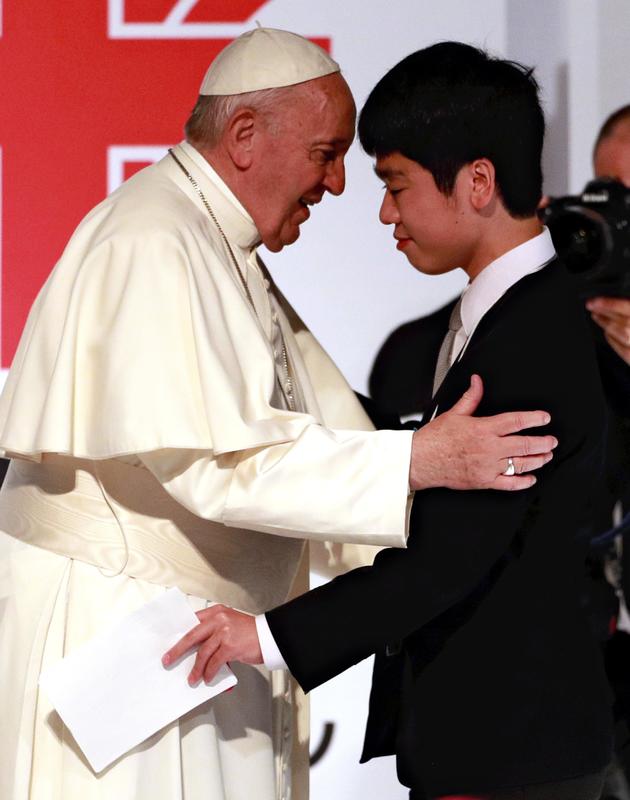 After the speech, the pope and Kamoshita embraced.