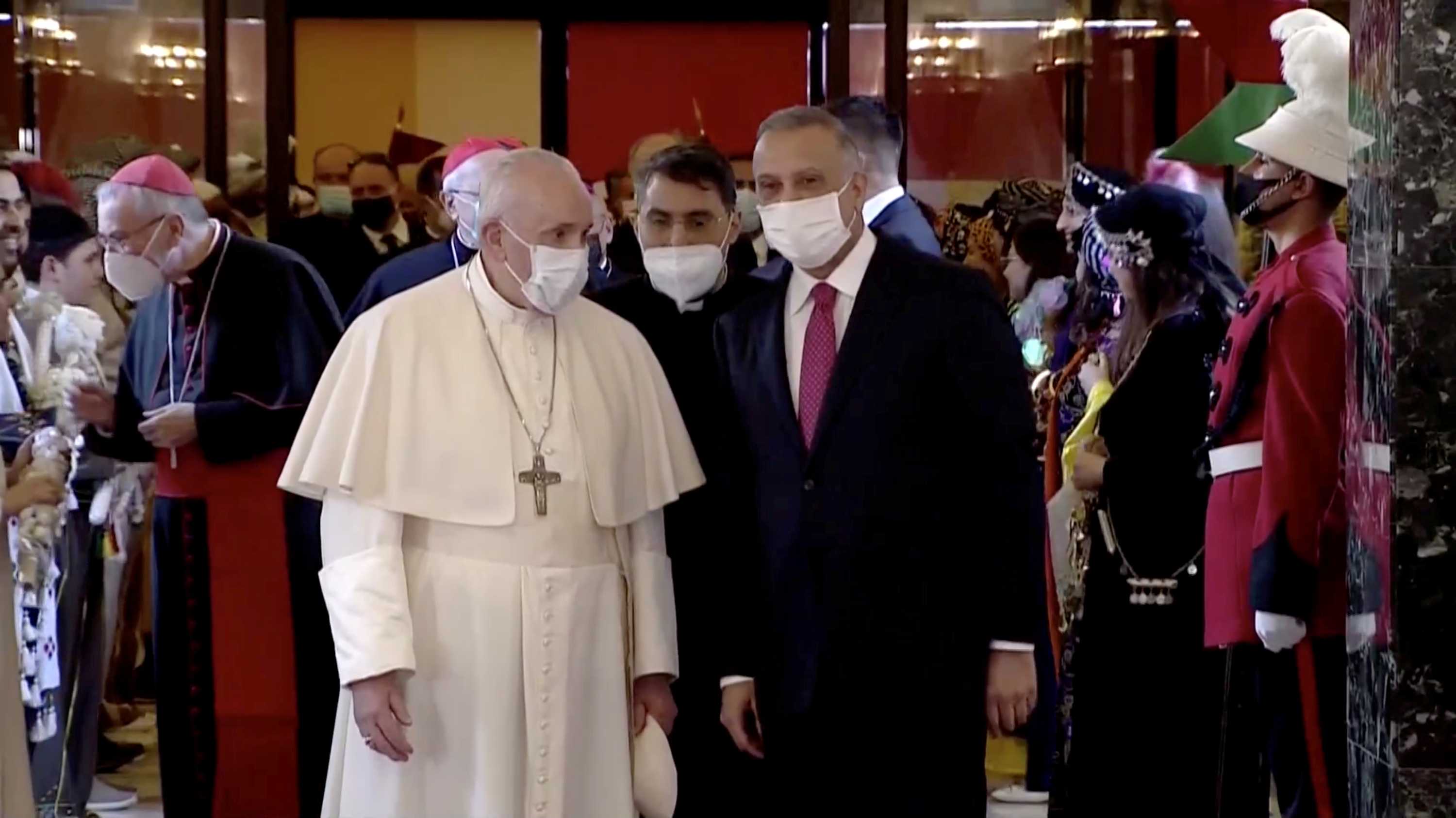 "May the clash of arms be silenced … may there be an end to acts of violence and extremism," he said, addressing Iraqi President Barham Salih, politicians and diplomats at the presidential palace.