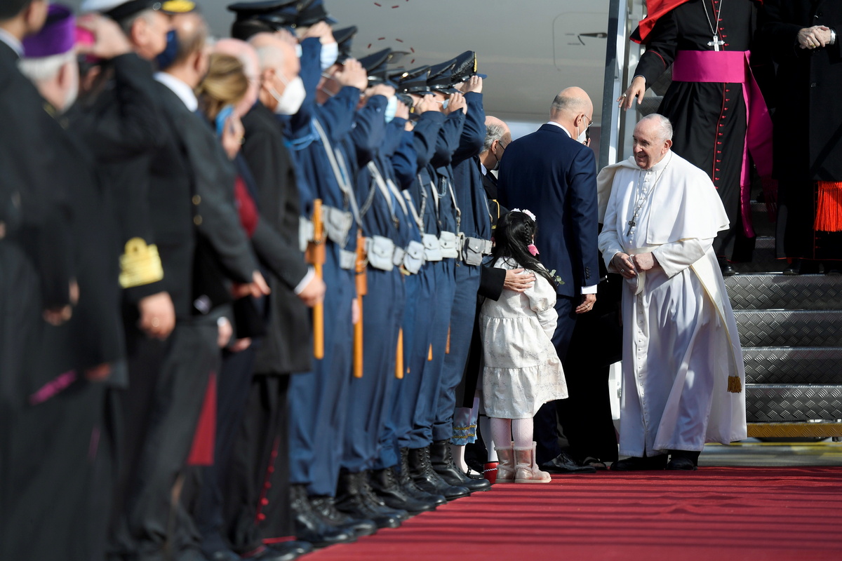 Young children in traditional Greek dress, a well as a boy from Africa and a girl from the Philippines, greeted Francis as he stepped off the plane and rode into the city in a simple Fiat 500. Since the start of his papacy in 2013, the Argentine pontiff has shunned large cars or bulletproof vehicles.