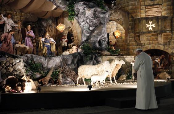 After the traditional evening prayers inside the basilica, he made his way through the crowd towards a life-size Nativity scene.