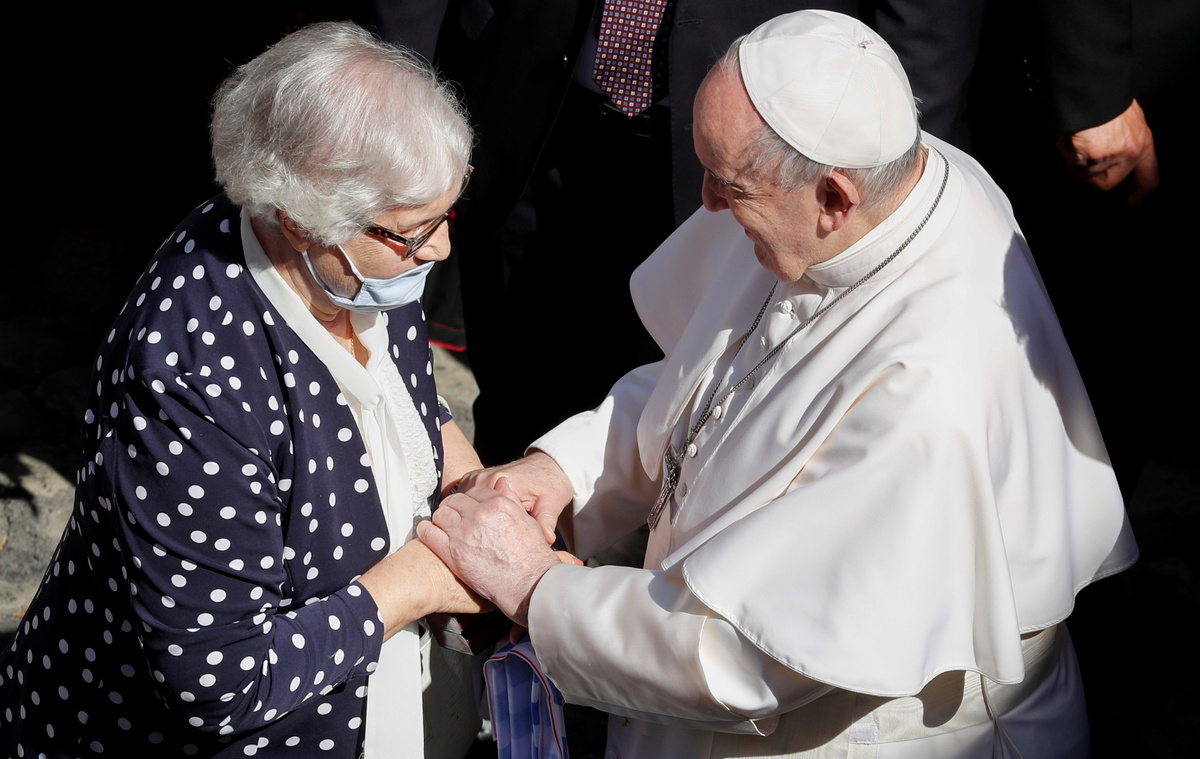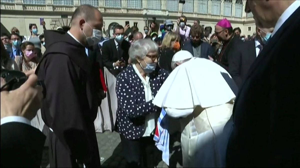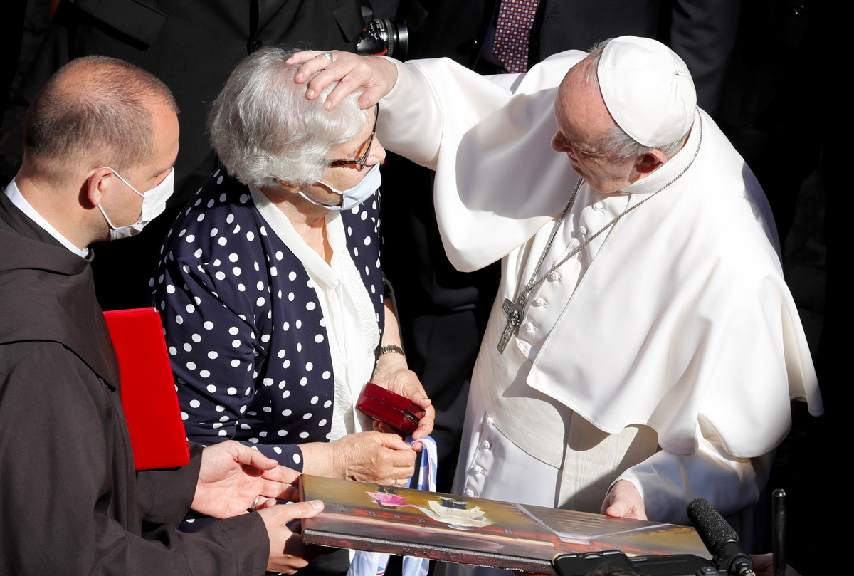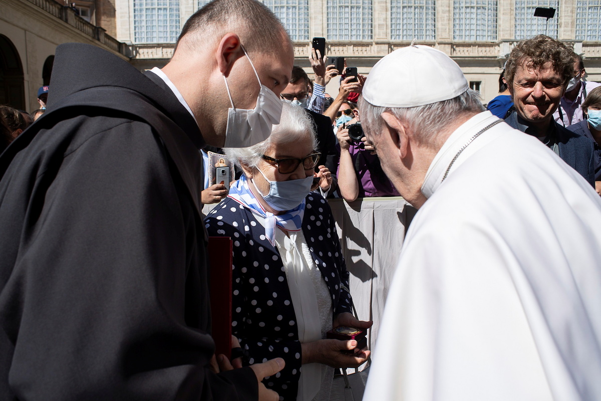 The pope listened intently as a Polish priest who accompanied Lidia Maksymowicz, 80, told him of her story.