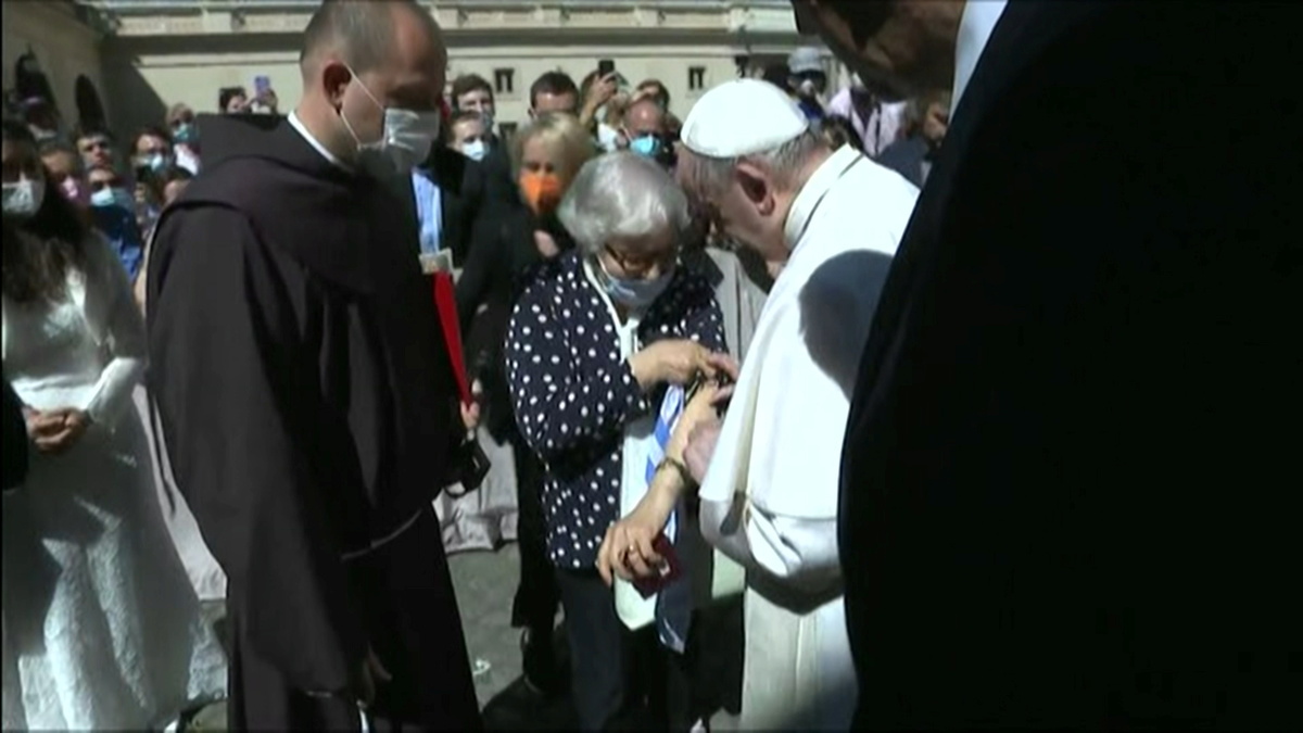 Pope Francis kissed the number tattooed on the arm of a survivor of medical experiments at the Auschwitz Nazi concentration camp when she was introduced to him on Wednesday.