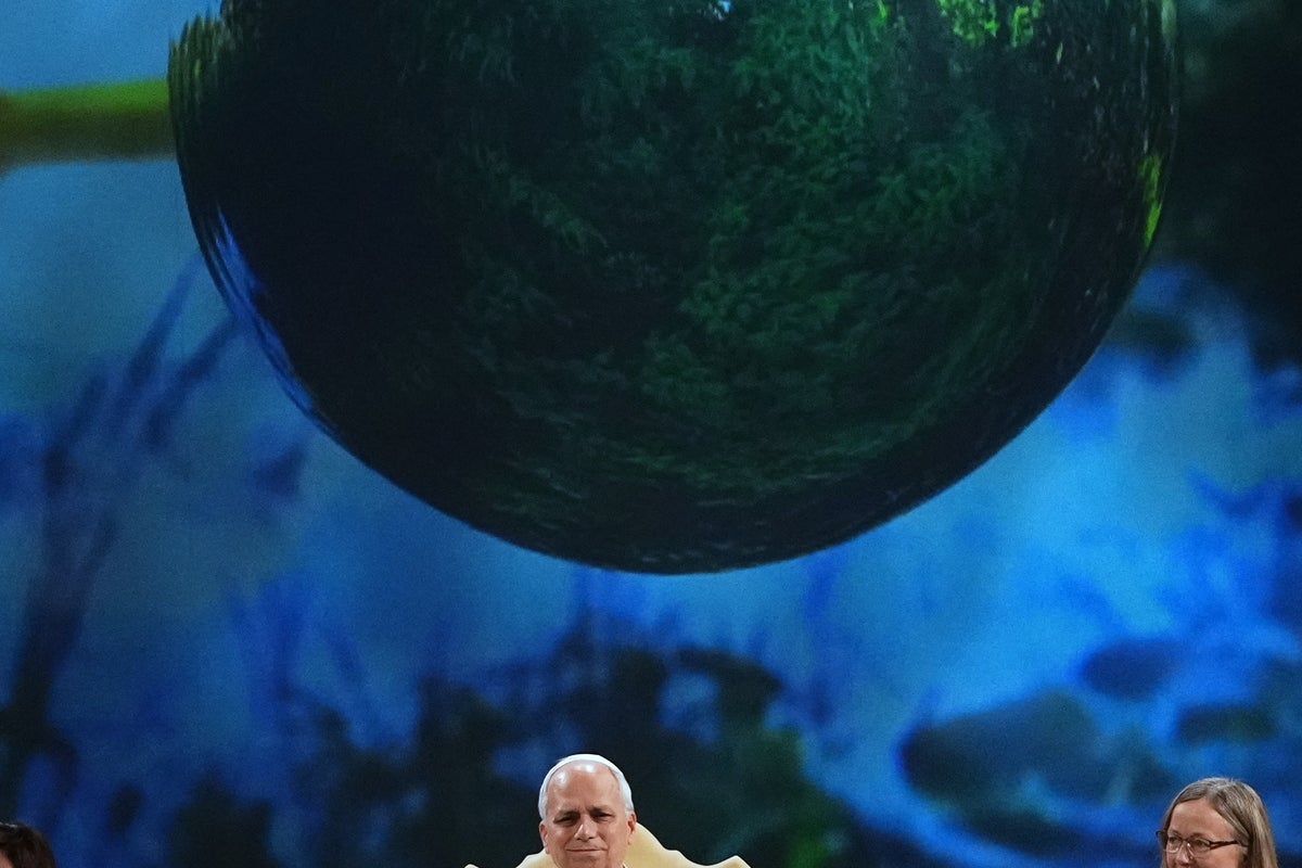 “We cannot love God, whom we cannot see, while despising his creatures. Nor can we call ourselves disciples of Jesus Christ without participating in his outlook on creation and his care for all that is fragile and wounded,” he said, presiding on a stage that featured a huge hunk of a melting glacier from Greenland and tropical ferns.