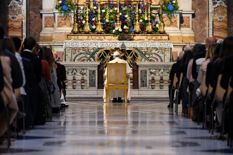 Francis led an evening rosary service attended by about 200 rank-and-file faithful, including many children, who sat spaced apart according to COVID-19 protocols.