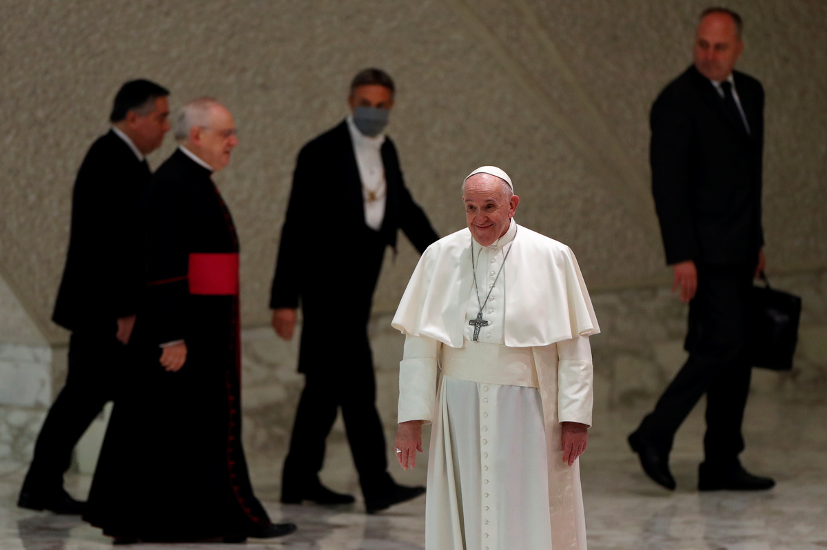 Pope Francis on Wednesday described the COVID-19 pandemic as a tough "lady" taskmaster who must be obeyed, but he and most close aides did not wear masks at his general audience.