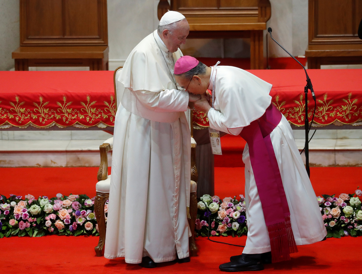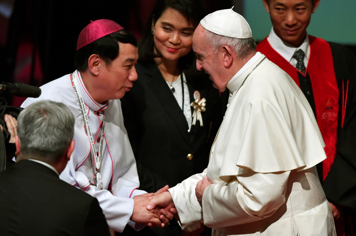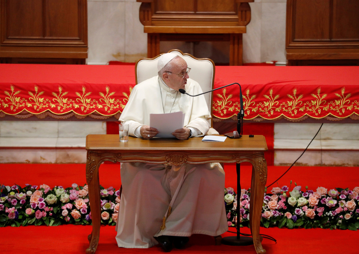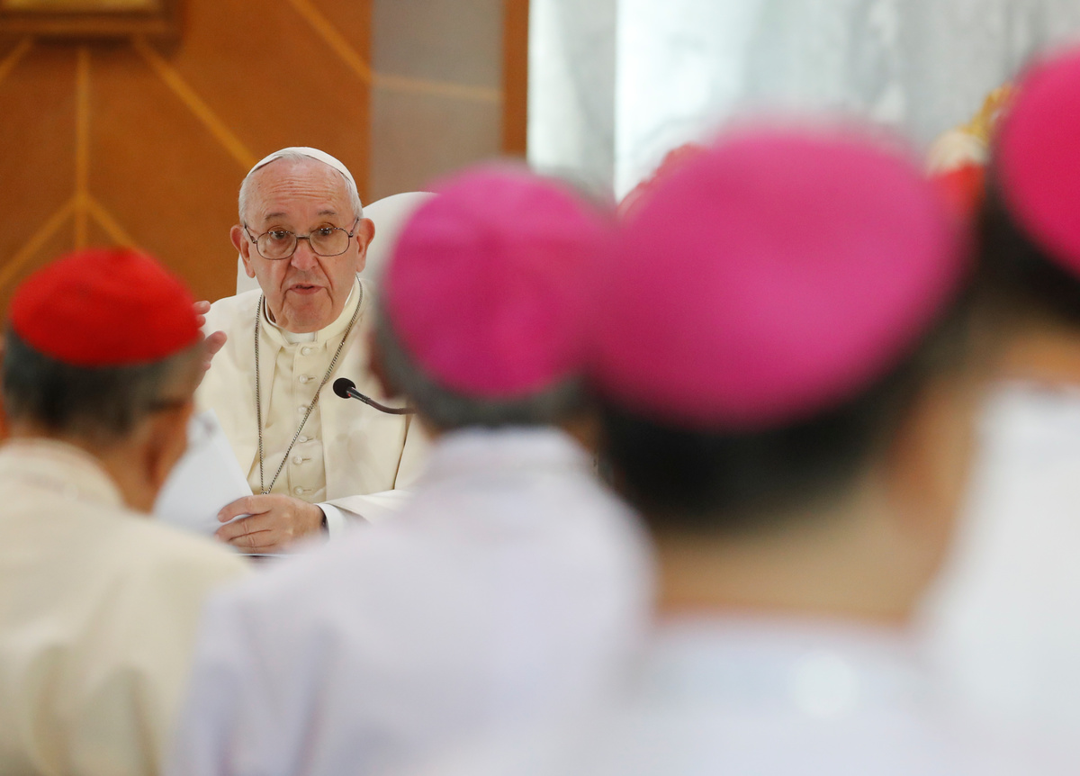 Pope Francis attends a meeting with cardinals and bishops at the Blessed Nicholas Boonkerd Kitbamrung Shrine in Bankgok, Thailand November 22, 2019. Vatican Media/Handout via REUTERS