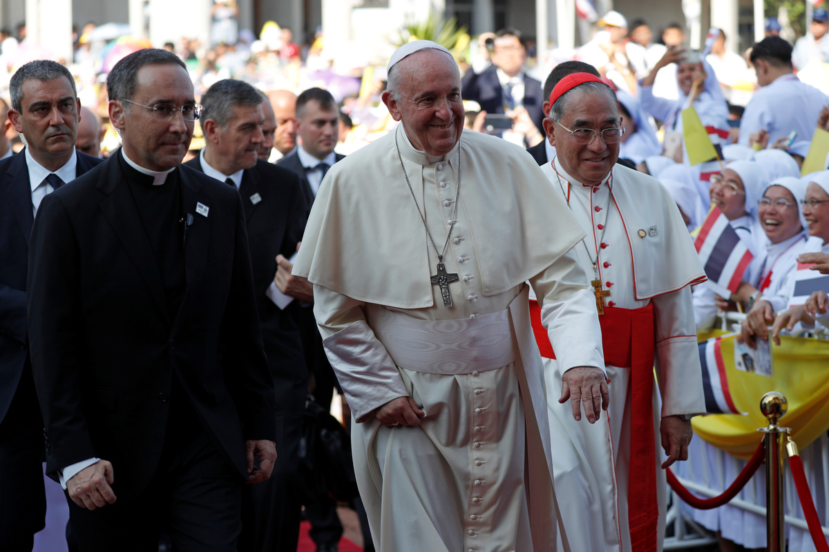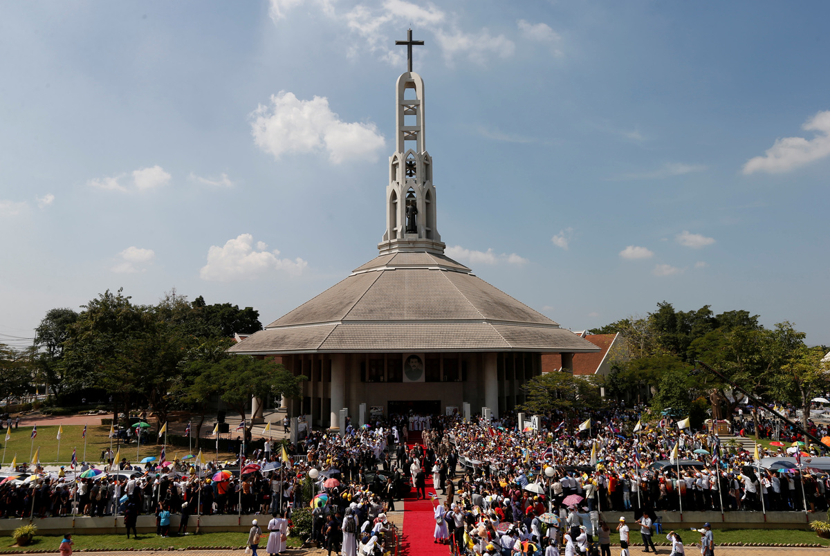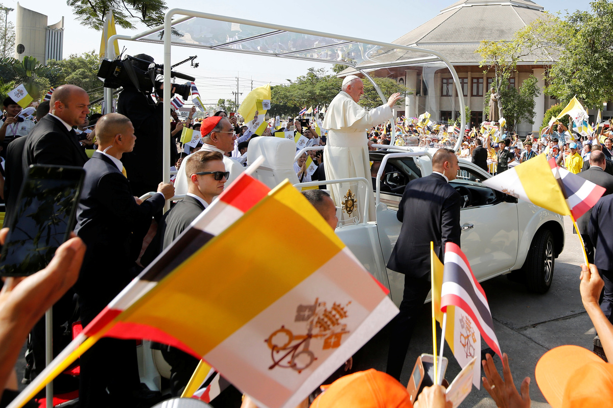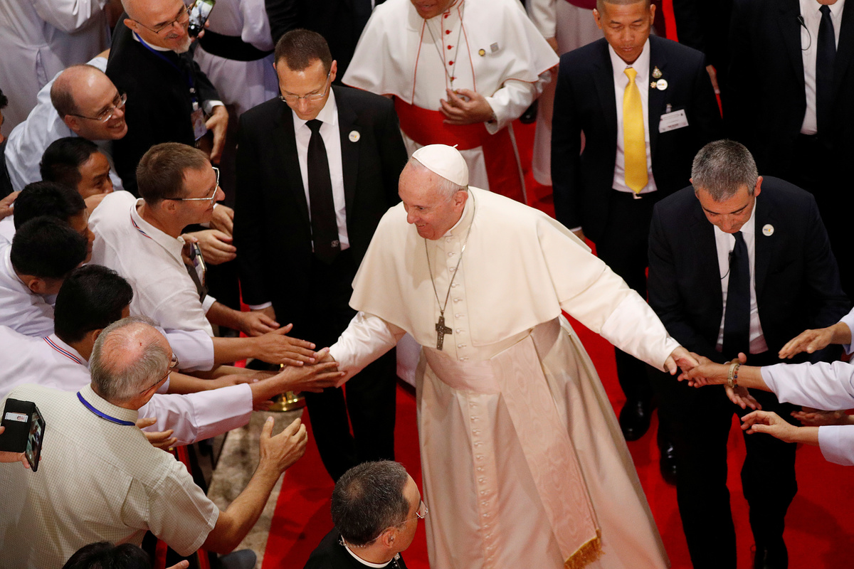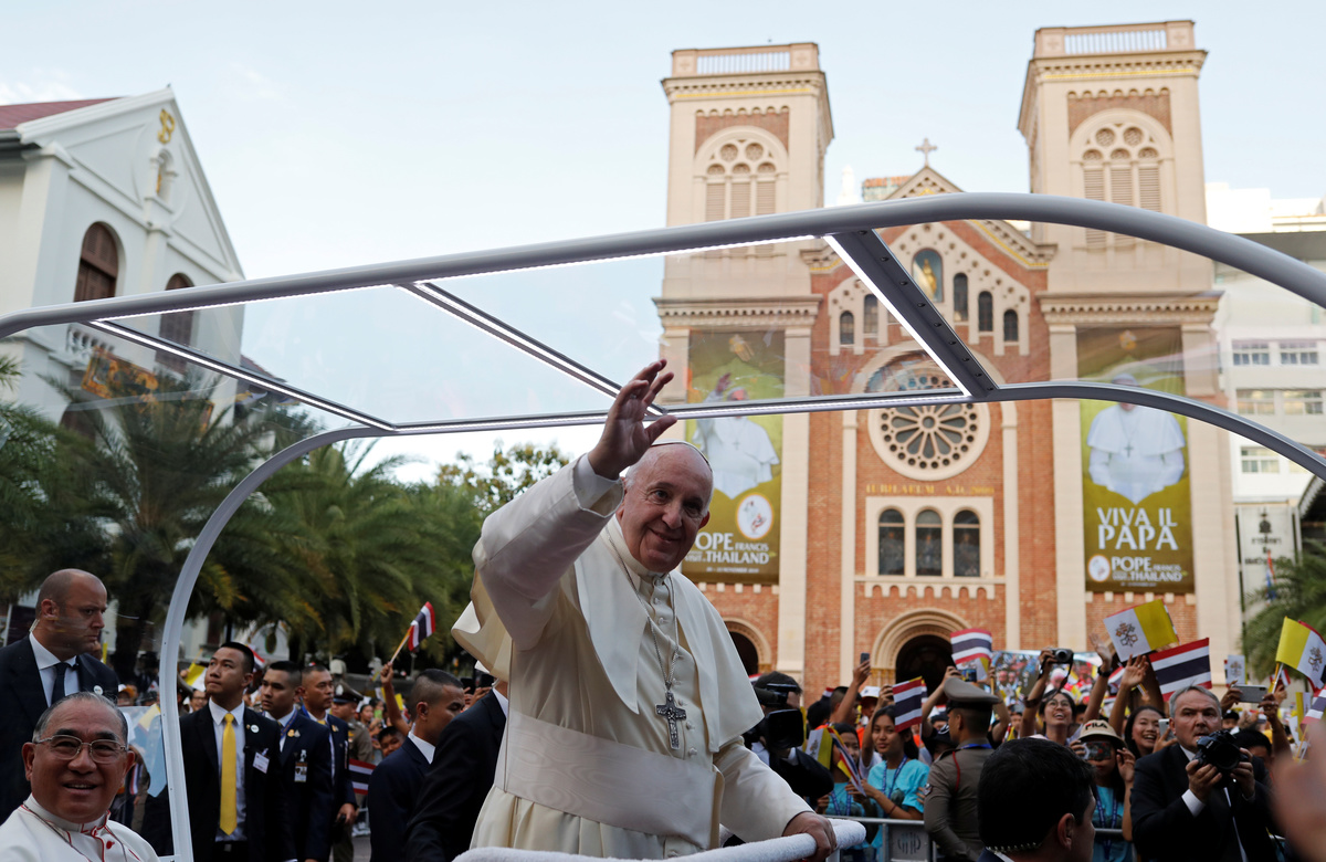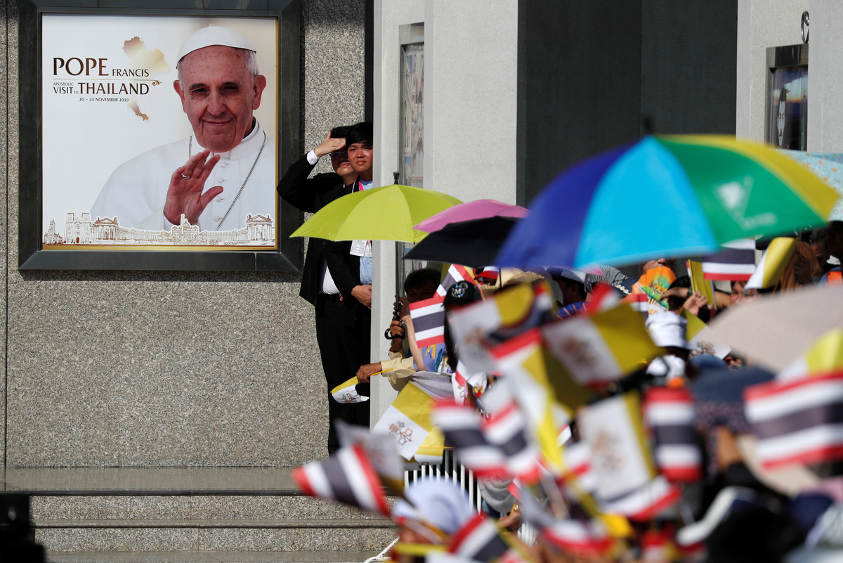 People are seen as Pope Francis arrives to conduct a Holy Mass at the Assumption Cathedral in Bangkok, Thailand, November 22, 2019. REUTERS/Jorge SilvaPope Francis holds a Holy Mass at the Assumption Cathedral in Bangkok, Thailand, November 22, 2019. REUTERS/Remo CasilliPope Francis arrives to conduct a Holy Mass at the Assumption Cathedral in Bangkok, Thailand, November 22, 2019. REUTERS/Jorge SilvaPope Francis waves from the pope mobile as he arrives to conduct a Holy Mass at the Assumption Cathedral in Bangkok, Thailand, November 22, 2019. REUTERS/Jorge SilvaPope Francis meets religious leaders at the Chulalongkorn University in Bangkok, Thailand, November 22, 2019. REUTERS/Remo CasilliA school band waits before Pope Francis arrives to conduct a Holy Mass at the Assumption Cathedral in Bangkok, Thailand, November 22, 2019. REUTERS/Jorge SilvaPope Francis speaks during a meeting with religious leaders at the Chulalongkorn University in Bangkok, Thailand, November 22, 2019. REUTERS/Remo CasilliPope Francis waves to the crowd following his visit to St. Peter's Parish church in the Sam Phran district of Nakhon Pathom Province, Thailand, November 22, 2019. REUTERS/Ann WangWomen pose with a cardboard depicting Pope Francis before he arrives to conduct a Holy Mass at the Assumption Cathedral in Bangkok, Thailand, November 22, 2019. REUTERS/Jorge SilvaPope Francis and his cousin Sister Ana Rosa Sivori exchange gifts with Thailand's King Maha Vajiralongkorn and Queen Suthida during his visit to Bangkok, Thailand, November 21, 2019. Thailand Royal Household/Handout via REUTERS Pope Francis meets with Thailand's King Maha Vajiralongkorn and Queen Suthida during his visit to Bangkok, Thailand, November 21, 2019. Thailand Royal Household/Handout via REUTERS A devotee prays as Pope Francis visits St. PeterÕs Parish church in the Sam Phran district of Nakhon Pathom Province, Thailand, November 22, 2019. REUTERS/Ann WangPope Francis waves to the crowd following his visit to St. Peter's Parish church in the Sam Phran district of Nakhon Pathom Province, Thailand, November 22, 2019. REUTERS/Ann WangThai Bishop Joseph Prathan Sridarunsil kisses the hand of Pope Francis during the latter's visit to St. Peter’s Parish church in the Sam Phran district of Nakhon Pathom Province, Thailand, November 22, 2019. REUTERS/Remo CasilliPope Francis visits St. Peter’s Parish church in the Sam Phran district of Nakhon Pathom Province, Thailand, November 22, 2019. REUTERS/Jorge SilvaA view of St. Peter's Parish church in the Sam Phran district of Nakhon Pathom Province, Thailand, during Pope Francis' visit November 22, 2019. REUTERS/Soe Zeya TunDevotees hold Thai flags as Pope Francis visits St. Peter’s Parish church in the Sam Phran district of Nakhon Pathom Province, Thailand, November 22, 2019. REUTERS/Ann WangPope Francis speaks at a meeting with cardinals and bishops at the Blessed Nicholas Boonkerd Kitbamrung Shrine in Bangkok, Thailand, November 22, 2019. REUTERS/Remo CasilliAn image of Pope Francis is seen during his visit to St. Peter's Parish church in the Sam Phran district of Nakhon Pathom Province, Thailand, November 22, 2019. REUTERS/Soe Zeya TunPope Francis visits St. Peter's Parish church in the Sam Phran district of Nakhon Pathom Province, Thailand, November 22, 2019. REUTERS/Soe Zeya TunPope Francis visits St. Peter's Parish church in the Sam Phran district of Nakhon Pathom Province, Thailand, November 22, 2019. REUTERS/Soe Zeya TunA devotee holding a Thai flag peers through glass panels after Pope Francis walked into St. Peter’s Parish church in the Sam Phran district of Nakhon Pathom Province, Thailand, November 22, 2019. REUTERS/Ann WangPope Francis visits St. Peter's Parish church in the Sam Phran district of Nakhon Pathom Province, Thailand, November 22, 2019. REUTERS/Soe Zeya TunPope Francis speaks during his visit to St. Peter's Parish church in the Sam Phran district of Nakhon Pathom Province, Thailand, November 22, 2019. REUTERS/Soe Zeya TunDevotees greet Pope Francis as he visits St. Peter's Parish church in the Sam Phran district of Nakhon Pathom Province, Thailand, November 22, 2019. REUTERS/Soe Zeya TunDevotees greet Pope Francis as he visits St. Peter's Parish church in the Sam Phran district of Nakhon Pathom Province, Thailand, November 22, 2019. REUTERS/Soe Zeya TunPope Francis visits St. Peter's Parish church in the Sam Phran district of Nakhon Pathom Province, Thailand, November 22, 2019. REUTERS/Soe Zeya Tun