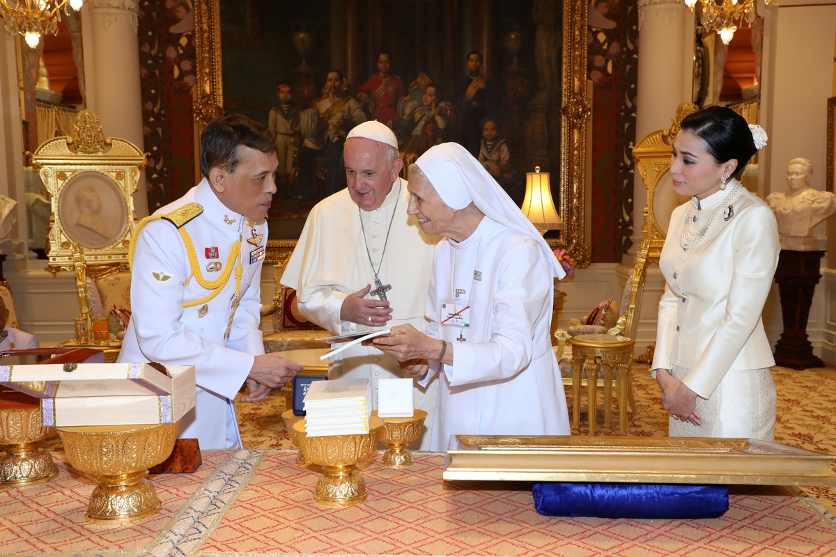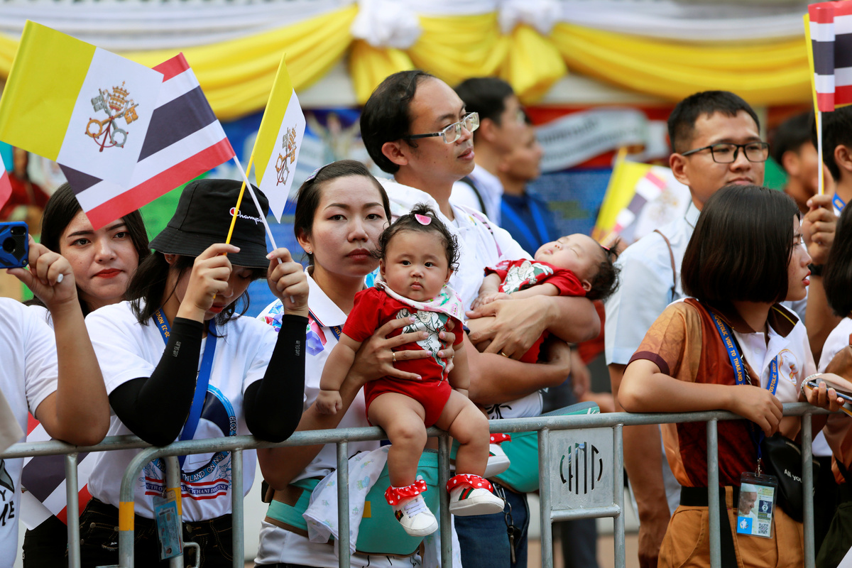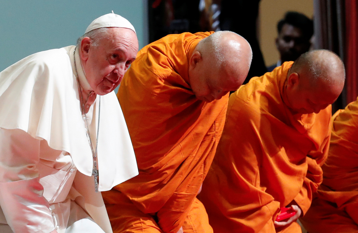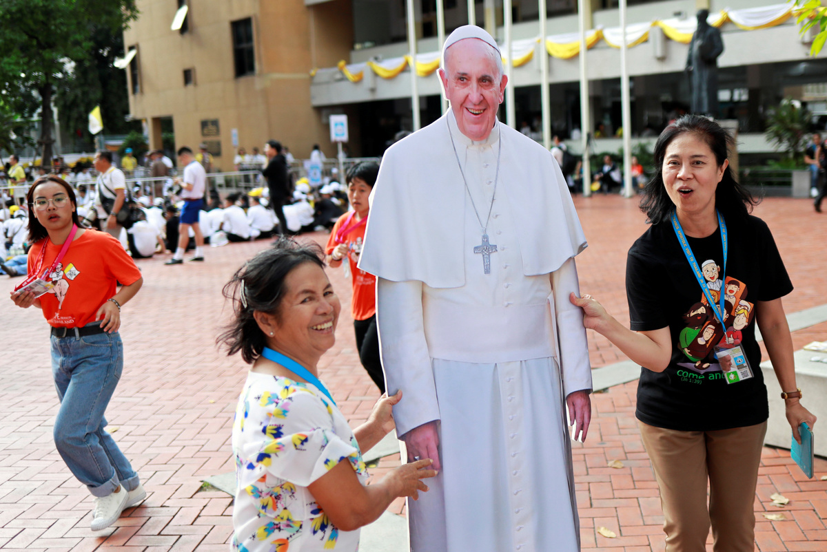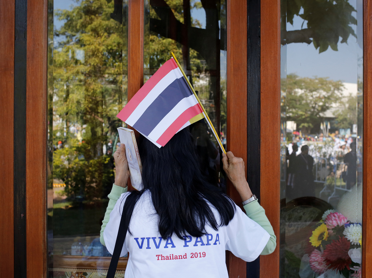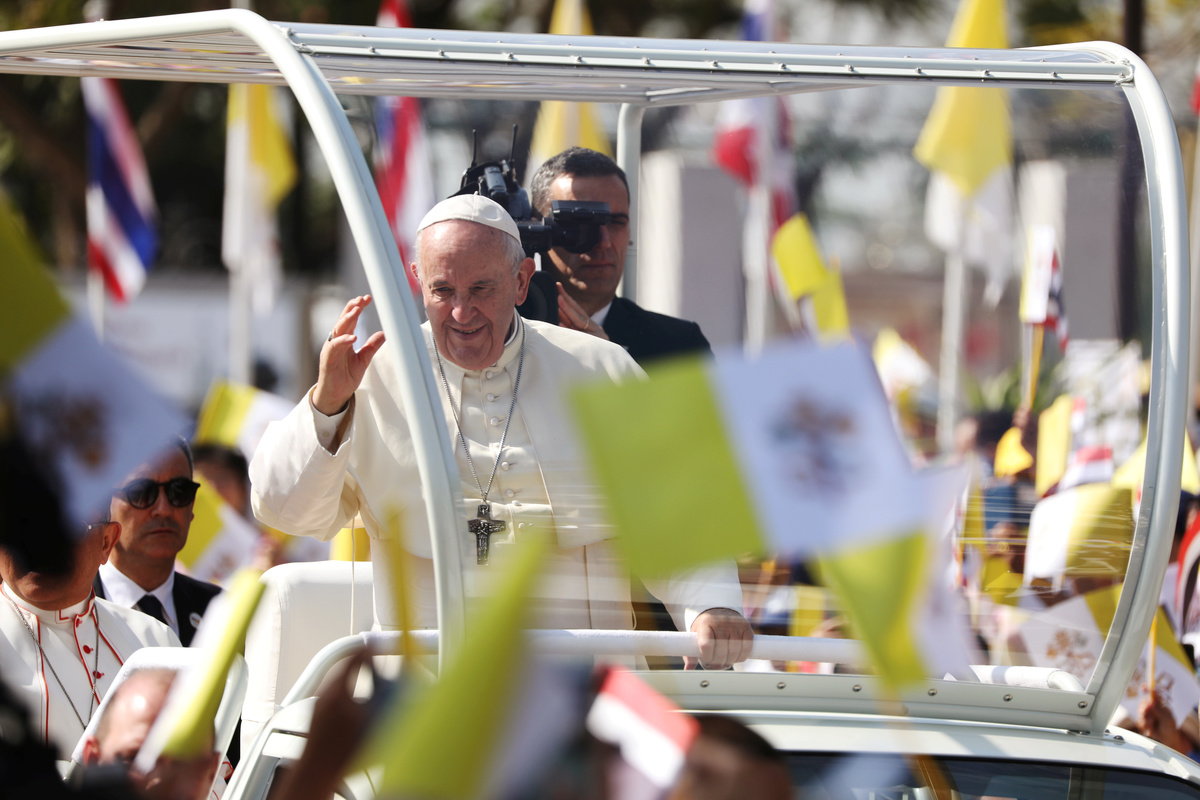 People are seen as Pope Francis arrives to conduct a Holy Mass at the Assumption Cathedral in Bangkok, Thailand, November 22, 2019. REUTERS/Jorge SilvaPope Francis holds a Holy Mass at the Assumption Cathedral in Bangkok, Thailand, November 22, 2019. REUTERS/Remo CasilliPope Francis arrives to conduct a Holy Mass at the Assumption Cathedral in Bangkok, Thailand, November 22, 2019. REUTERS/Jorge SilvaPope Francis waves from the pope mobile as he arrives to conduct a Holy Mass at the Assumption Cathedral in Bangkok, Thailand, November 22, 2019. REUTERS/Jorge SilvaPope Francis meets religious leaders at the Chulalongkorn University in Bangkok, Thailand, November 22, 2019. REUTERS/Remo CasilliA school band waits before Pope Francis arrives to conduct a Holy Mass at the Assumption Cathedral in Bangkok, Thailand, November 22, 2019. REUTERS/Jorge SilvaPope Francis speaks during a meeting with religious leaders at the Chulalongkorn University in Bangkok, Thailand, November 22, 2019. REUTERS/Remo CasilliPope Francis waves to the crowd following his visit to St. Peter's Parish church in the Sam Phran district of Nakhon Pathom Province, Thailand, November 22, 2019. REUTERS/Ann WangWomen pose with a cardboard depicting Pope Francis before he arrives to conduct a Holy Mass at the Assumption Cathedral in Bangkok, Thailand, November 22, 2019. REUTERS/Jorge SilvaPope Francis and his cousin Sister Ana Rosa Sivori exchange gifts with Thailand's King Maha Vajiralongkorn and Queen Suthida during his visit to Bangkok, Thailand, November 21, 2019. Thailand Royal Household/Handout via REUTERS Pope Francis meets with Thailand's King Maha Vajiralongkorn and Queen Suthida during his visit to Bangkok, Thailand, November 21, 2019. Thailand Royal Household/Handout via REUTERS A devotee prays as Pope Francis visits St. PeterÕs Parish church in the Sam Phran district of Nakhon Pathom Province, Thailand, November 22, 2019. REUTERS/Ann WangPope Francis waves to the crowd following his visit to St. Peter's Parish church in the Sam Phran district of Nakhon Pathom Province, Thailand, November 22, 2019. REUTERS/Ann WangThai Bishop Joseph Prathan Sridarunsil kisses the hand of Pope Francis during the latter's visit to St. Peter’s Parish church in the Sam Phran district of Nakhon Pathom Province, Thailand, November 22, 2019. REUTERS/Remo CasilliPope Francis visits St. Peter’s Parish church in the Sam Phran district of Nakhon Pathom Province, Thailand, November 22, 2019. REUTERS/Jorge SilvaA view of St. Peter's Parish church in the Sam Phran district of Nakhon Pathom Province, Thailand, during Pope Francis' visit November 22, 2019. REUTERS/Soe Zeya TunDevotees hold Thai flags as Pope Francis visits St. Peter’s Parish church in the Sam Phran district of Nakhon Pathom Province, Thailand, November 22, 2019. REUTERS/Ann WangPope Francis speaks at a meeting with cardinals and bishops at the Blessed Nicholas Boonkerd Kitbamrung Shrine in Bangkok, Thailand, November 22, 2019. REUTERS/Remo CasilliAn image of Pope Francis is seen during his visit to St. Peter's Parish church in the Sam Phran district of Nakhon Pathom Province, Thailand, November 22, 2019. REUTERS/Soe Zeya TunPope Francis visits St. Peter's Parish church in the Sam Phran district of Nakhon Pathom Province, Thailand, November 22, 2019. REUTERS/Soe Zeya TunPope Francis visits St. Peter's Parish church in the Sam Phran district of Nakhon Pathom Province, Thailand, November 22, 2019. REUTERS/Soe Zeya TunA devotee holding a Thai flag peers through glass panels after Pope Francis walked into St. Peter’s Parish church in the Sam Phran district of Nakhon Pathom Province, Thailand, November 22, 2019. REUTERS/Ann WangPope Francis visits St. Peter's Parish church in the Sam Phran district of Nakhon Pathom Province, Thailand, November 22, 2019. REUTERS/Soe Zeya TunPope Francis speaks during his visit to St. Peter's Parish church in the Sam Phran district of Nakhon Pathom Province, Thailand, November 22, 2019. REUTERS/Soe Zeya TunDevotees greet Pope Francis as he visits St. Peter's Parish church in the Sam Phran district of Nakhon Pathom Province, Thailand, November 22, 2019. REUTERS/Soe Zeya TunDevotees greet Pope Francis as he visits St. Peter's Parish church in the Sam Phran district of Nakhon Pathom Province, Thailand, November 22, 2019. REUTERS/Soe Zeya TunPope Francis visits St. Peter's Parish church in the Sam Phran district of Nakhon Pathom Province, Thailand, November 22, 2019. REUTERS/Soe Zeya Tun