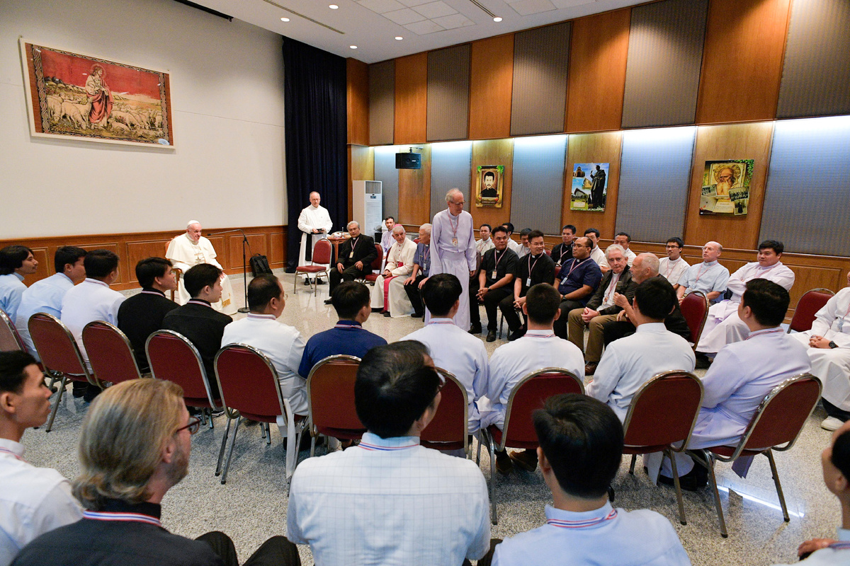 Pope Francis attends a private meeting with the Members of the Society of Jesus during his visit in Bankgok, Thailand November 22, 2019. Vatican Media/Handout via REUTERS