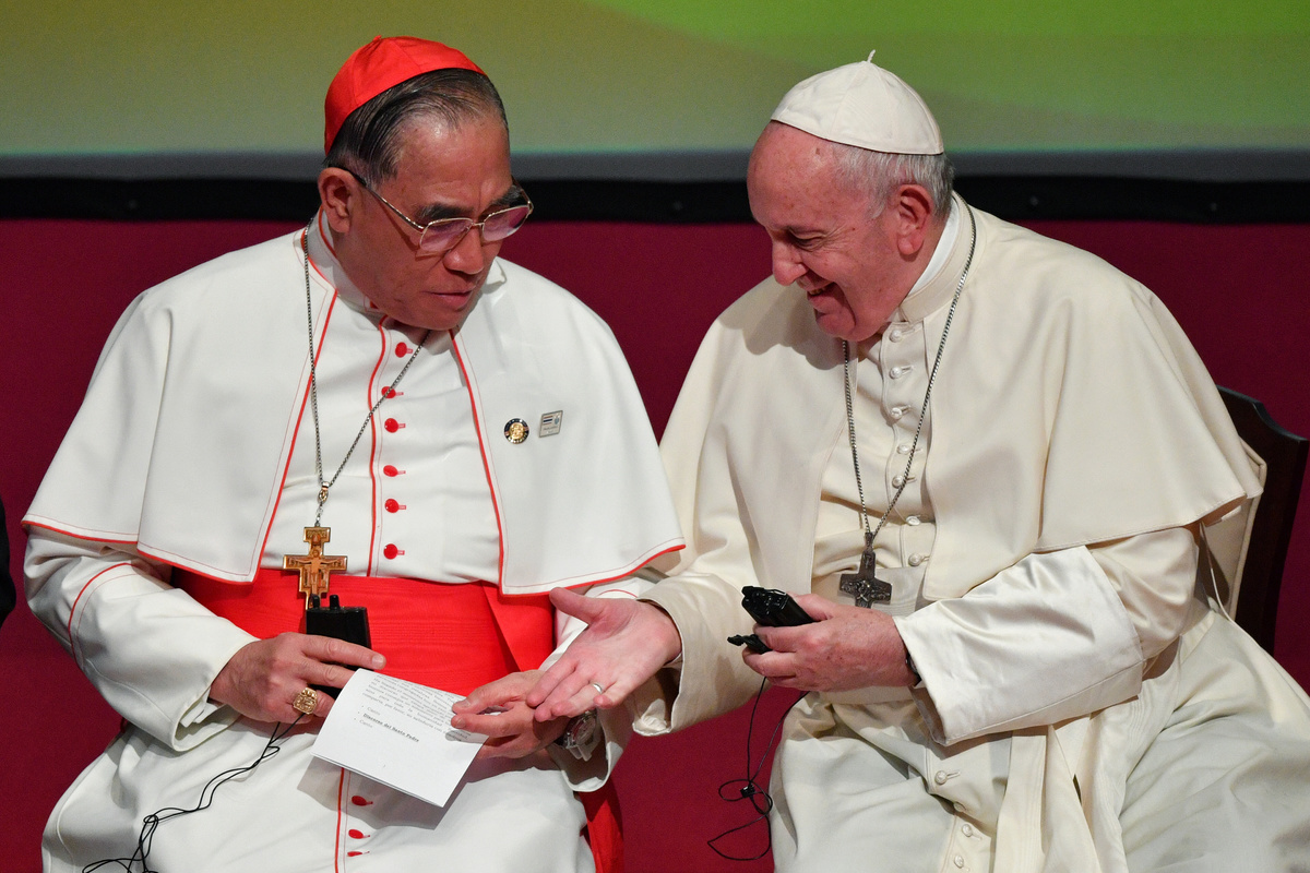 Pope Francis speaks with Cardinal Francis Xavier Kriengsak Kovithavanij during a meeting with religious leaders at the Chulalongkorn University in Bangkok, Thailand, November 22, 2019. REUTERS/Chalinee Thirasupa