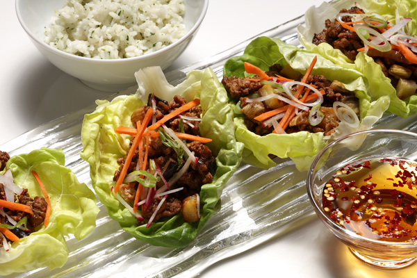 I serve the warm stir-fry with Boston lettuce or small romaine leaves and pass a spicy-sweet dipping sauce. A scoop of coconut rice can be enjoyed alongside or tucked into the lettuce as well. Alternatively, for appetizers, set out a bowl of the warm pork filling (no rice) with spears of Belgian endive or pita crisps. The filling also tastes great tucked into a warmed pita pocket or lightly toasted flour tortilla with shredded lettuce.
