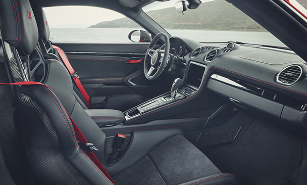 The 718 T has black accents on the exterior like on the 20-inch wheels and dashes of red inside. Note the sporty seats, cloth door pulls and more compact GT steering wheel.