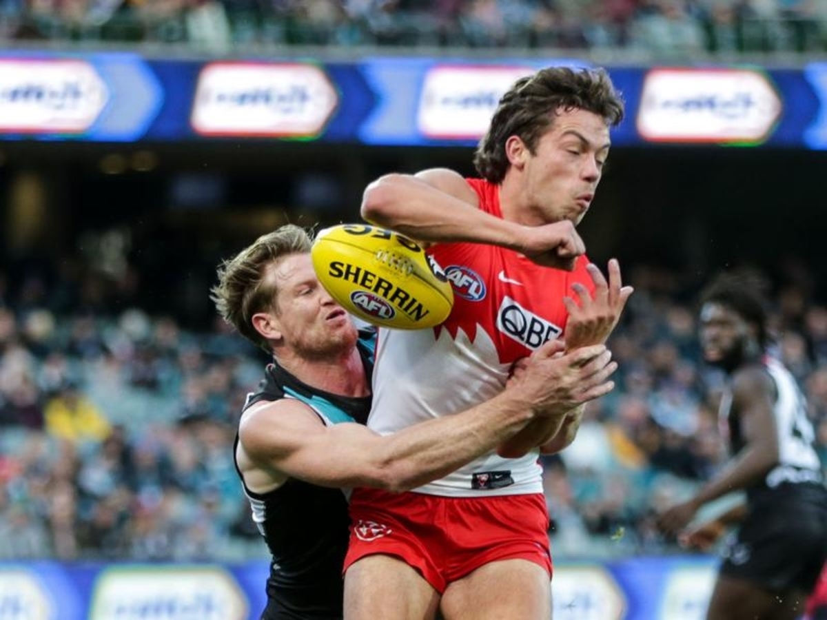 Port Adelaide have edged Sydney by 10 points to climb into the AFL's top four while star Swan Lance Franklin is on report.