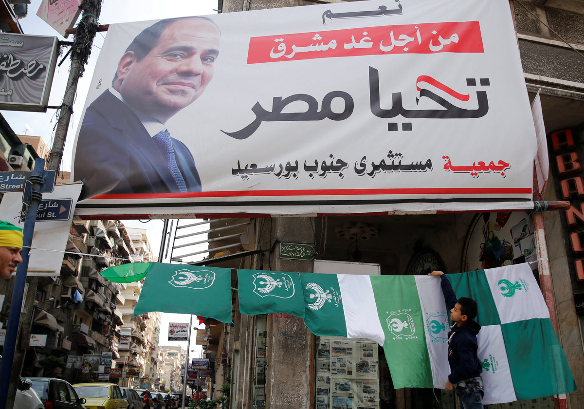 Soccer Football - African Confederation Cup - Al Masry vs Green Buffaloes - Al Masry stadium, Port Said, Egypt- February 10, 2018 General view of Al Masry flags hung up under a banner of Abdel Fattah el-Sisi the President of Egypt before the match REUTERS/Amr Abdallah Dalsh