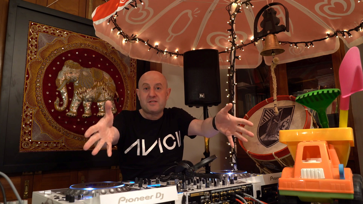 A lot of effort goes into Peixoto's livestream events. There are strobe and fairy lights, a turntable, mixers, a microphone and sparkling, colourful decorations.